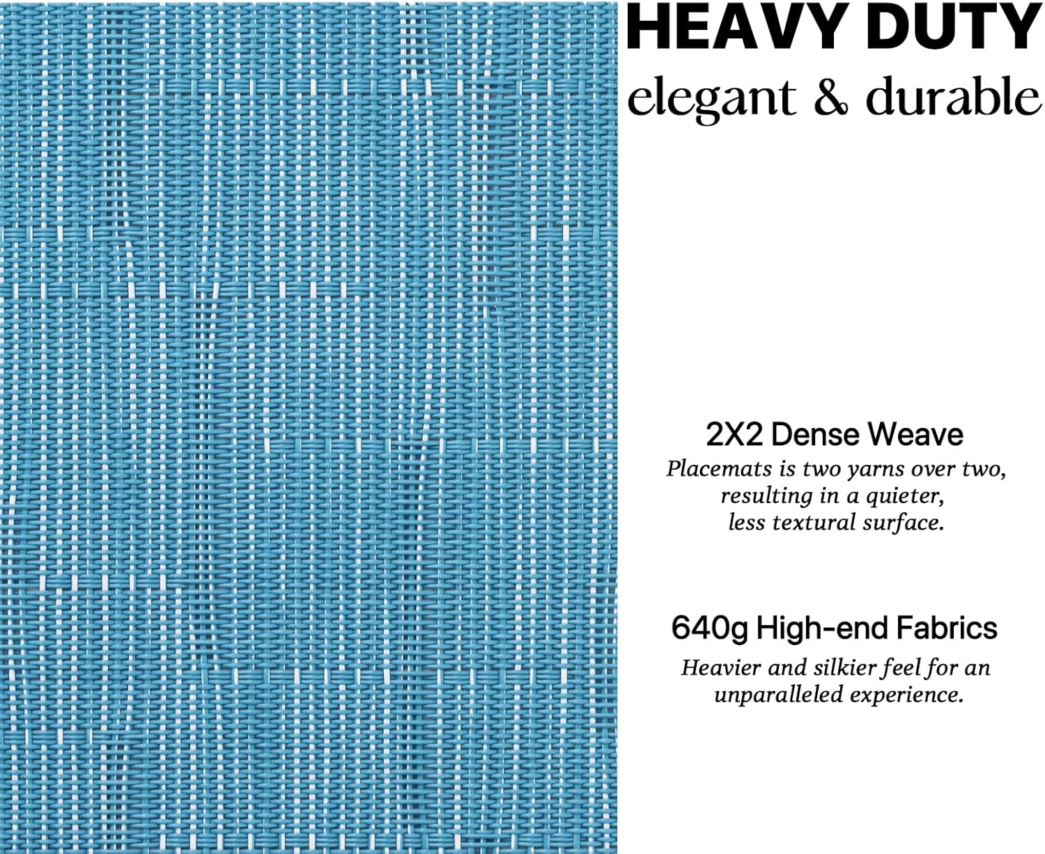 • HEAVY-DUTY:We uses the German-imported higher grammage vinyl material (Specialty PVC)than other placemats on the market,plus the precise,dense weave craftsmanship to give the woven placemats a thicker feel and make the place mats long-lasting.