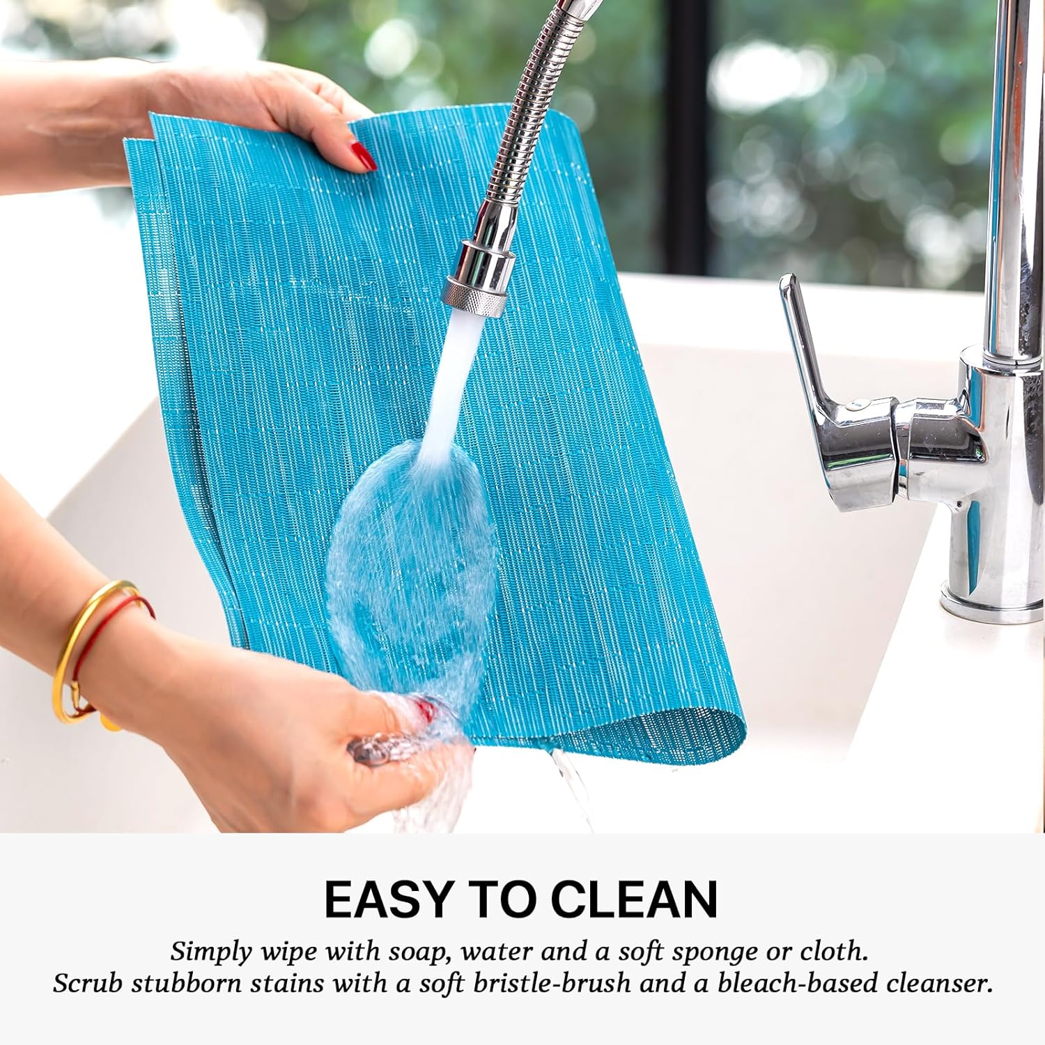 • EASY TO CLEAN:The washable placemats can be washed repeatedly.How to clean the place mats for kitchen table:Simply wipe with soap,water and a soft sponge or cloth.Scrub stubborn stains with a soft bristle-brush and a bleach-based cleanse.