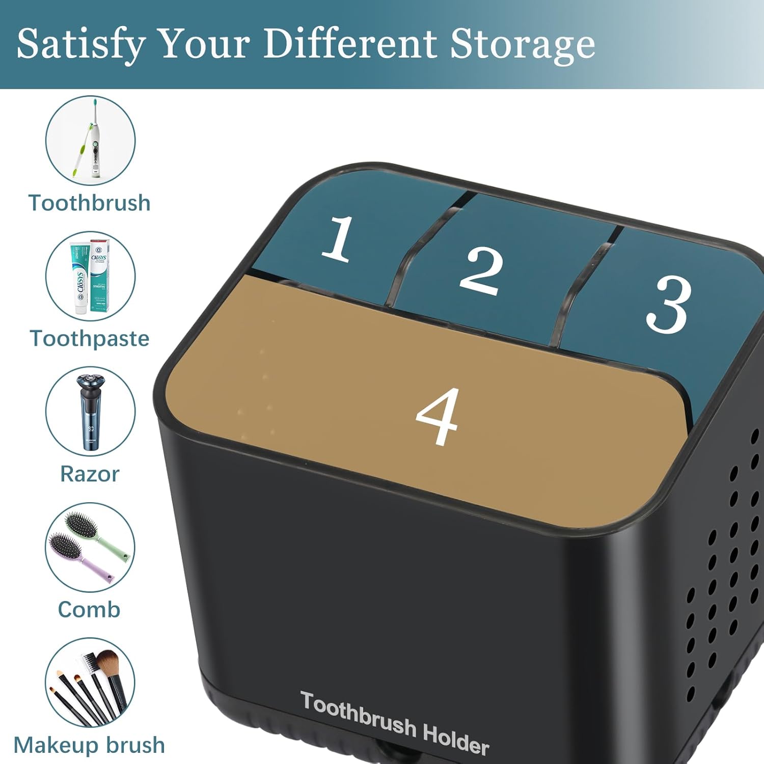 • DETACHABLE DESIGN: The toothbrush holders for bathrooms has a removable and compartmentalized design, with a total of 4 slots, it has enough capacity to store different kinds of bathroom storage, which greatly saves the storage space on the bathroom countertop. The removable design of the electric toothbrush holder is also easy for you to clean.