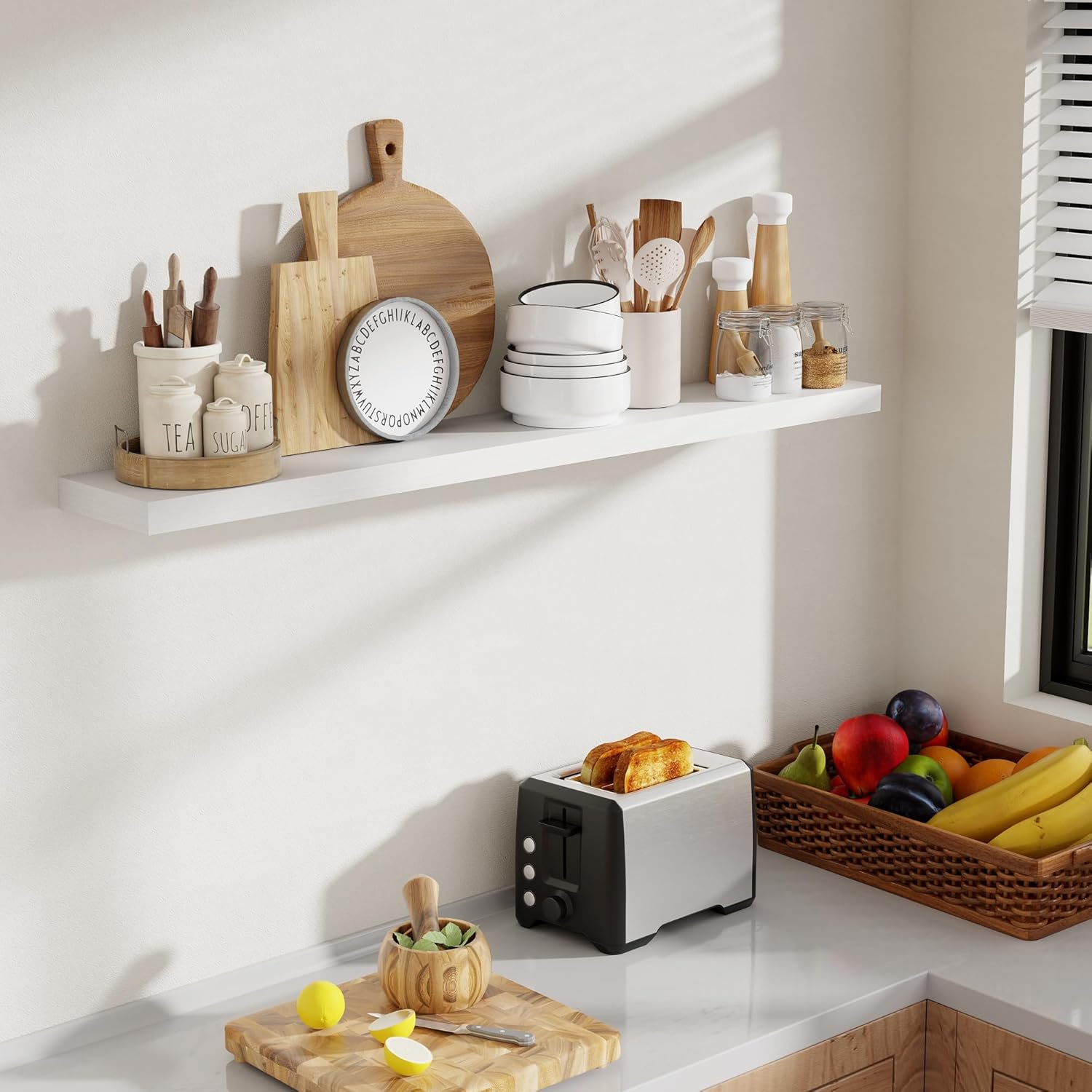 - [MAXIMIZE YOUR LIVING AREA]: Free up floor space with these floating wall shelves that are perfect for small apartments, kitchens, and compact living spaces. They create the illusion of a larger room, allowing you to store and showcase plants, collectibles, and other decor without taking up valuable floor space.