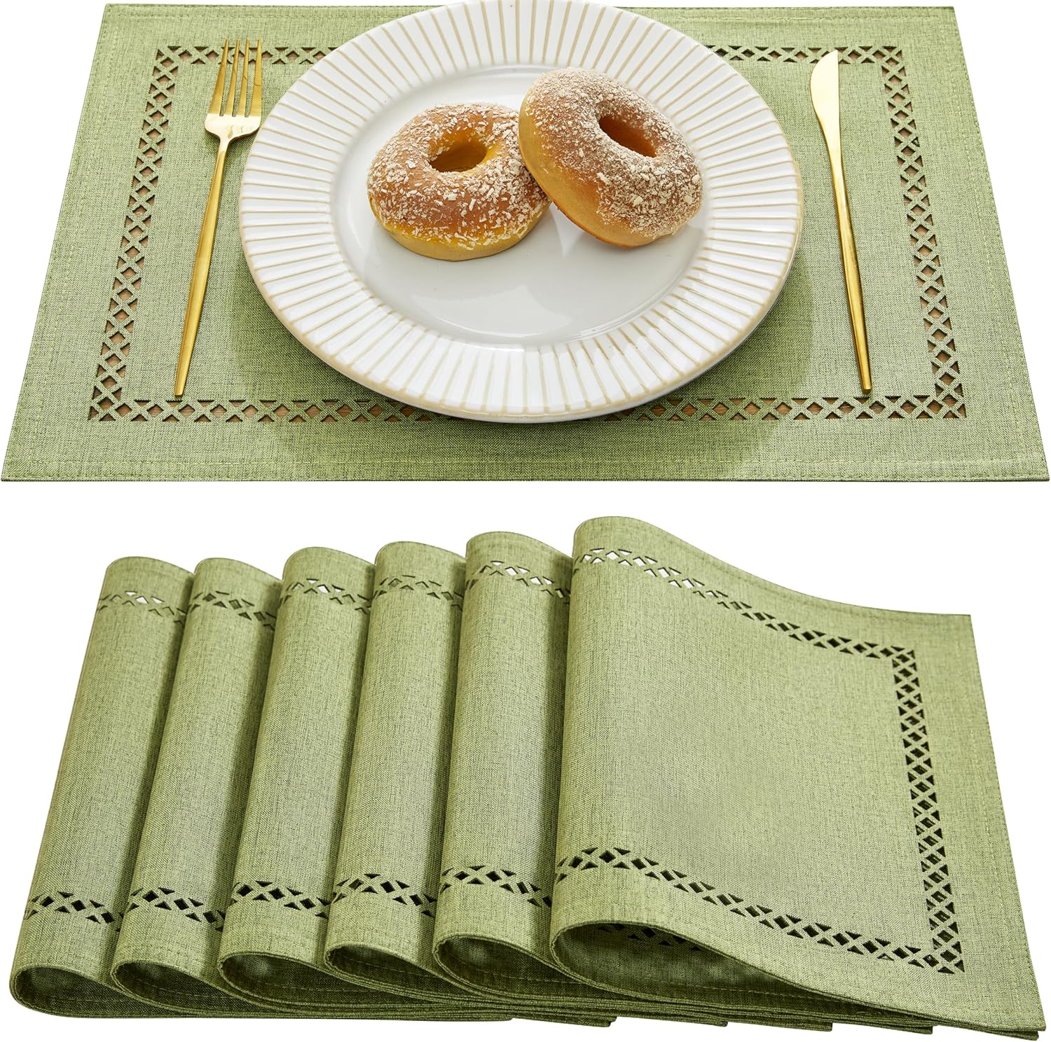 Burlap Placemats Set of 6, 12 x 18 Inch Rustic Geometric Hollow Place Mats, Heat Resistant Placemats for Farmhouse Kitchen Table Decor, Sage Green 6PCS