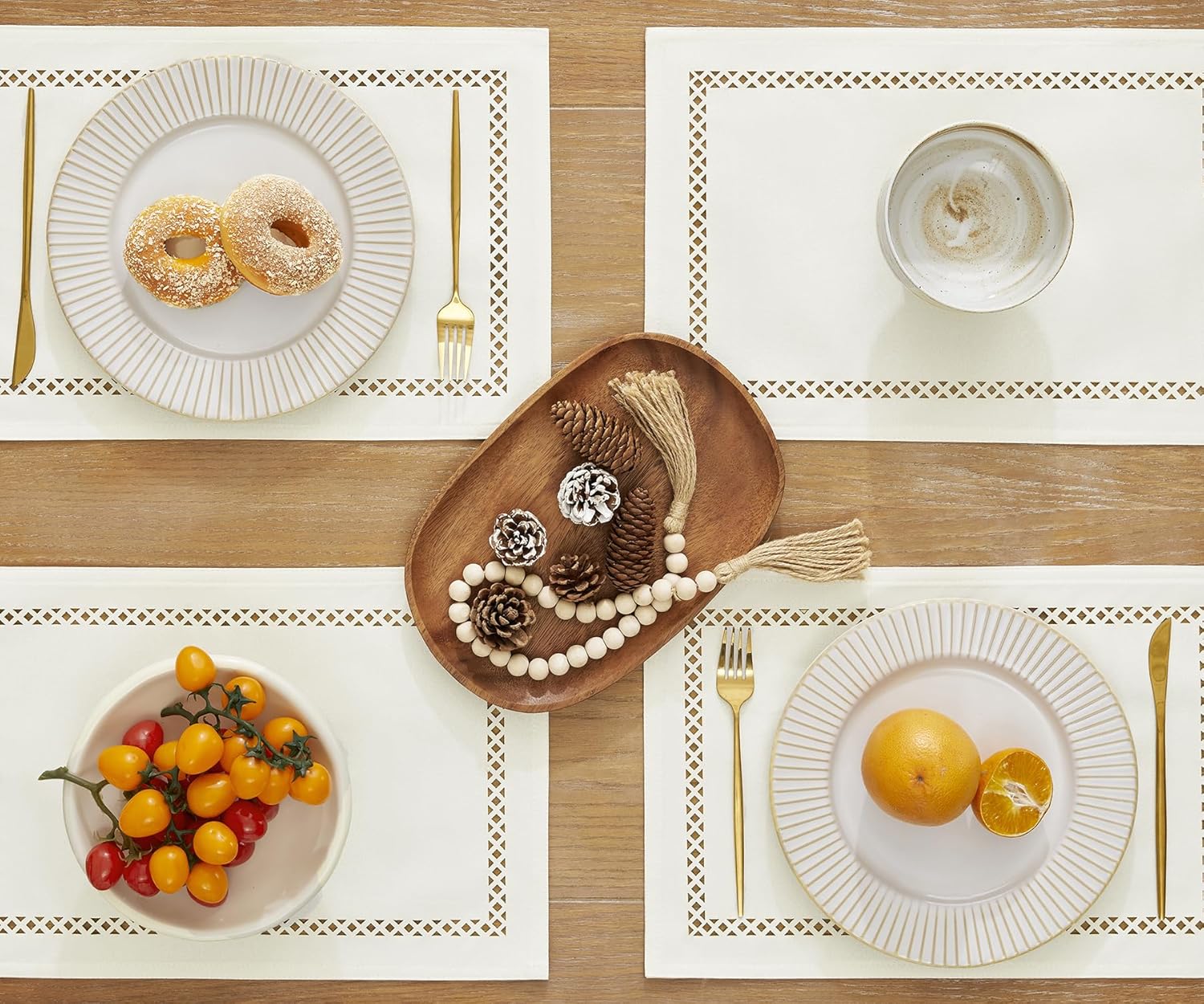 Burlap Placemats Set of 6, 12 x 18 Inch Rustic Geometric Hollow Place Mats, Heat Resistant Placemats for Farmhouse Kitchen Table Decor, Off White 6PCS