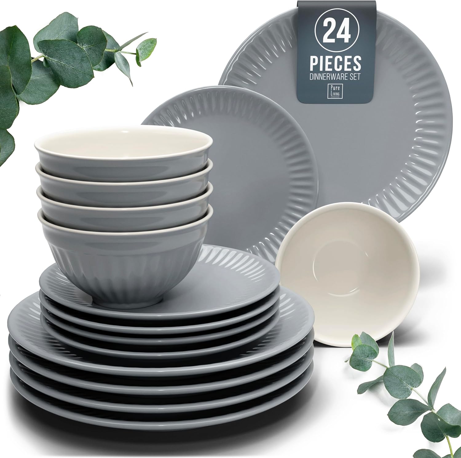 Stoneware Dinnerware Set for 8 People HYGGE 24-Piece - Elegant Scandi Design - Premium Dish Set - Bowl and Plate Set - Tableware for 8 People in a Ribbed Design - Pure Living in Gray-Blue