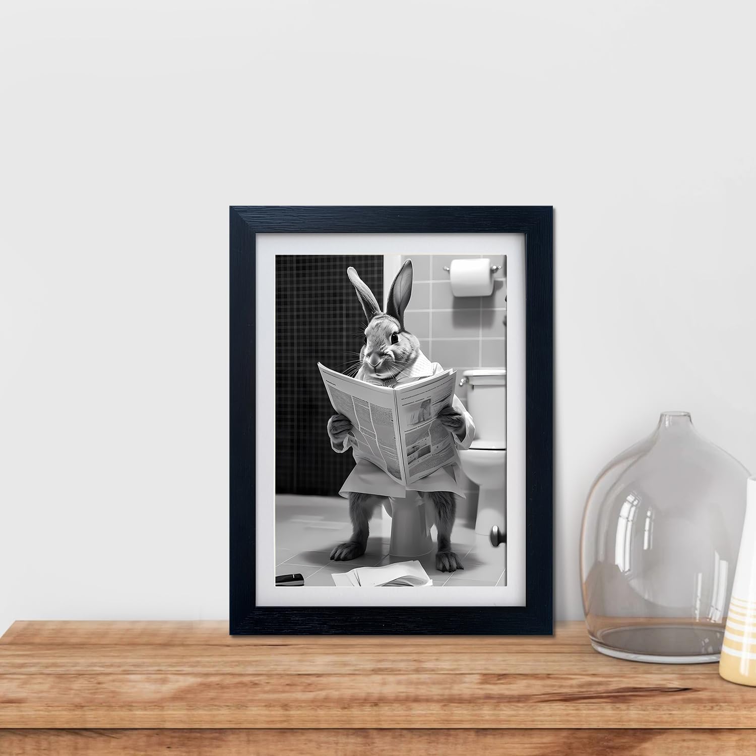 Kids Bathroom Wall Decor Cute Rabbit Reading Newspaper in the Toilet Black and White Farmhouse Animal Wall Art Framed Canvas Print Bathroom Picture Artwork