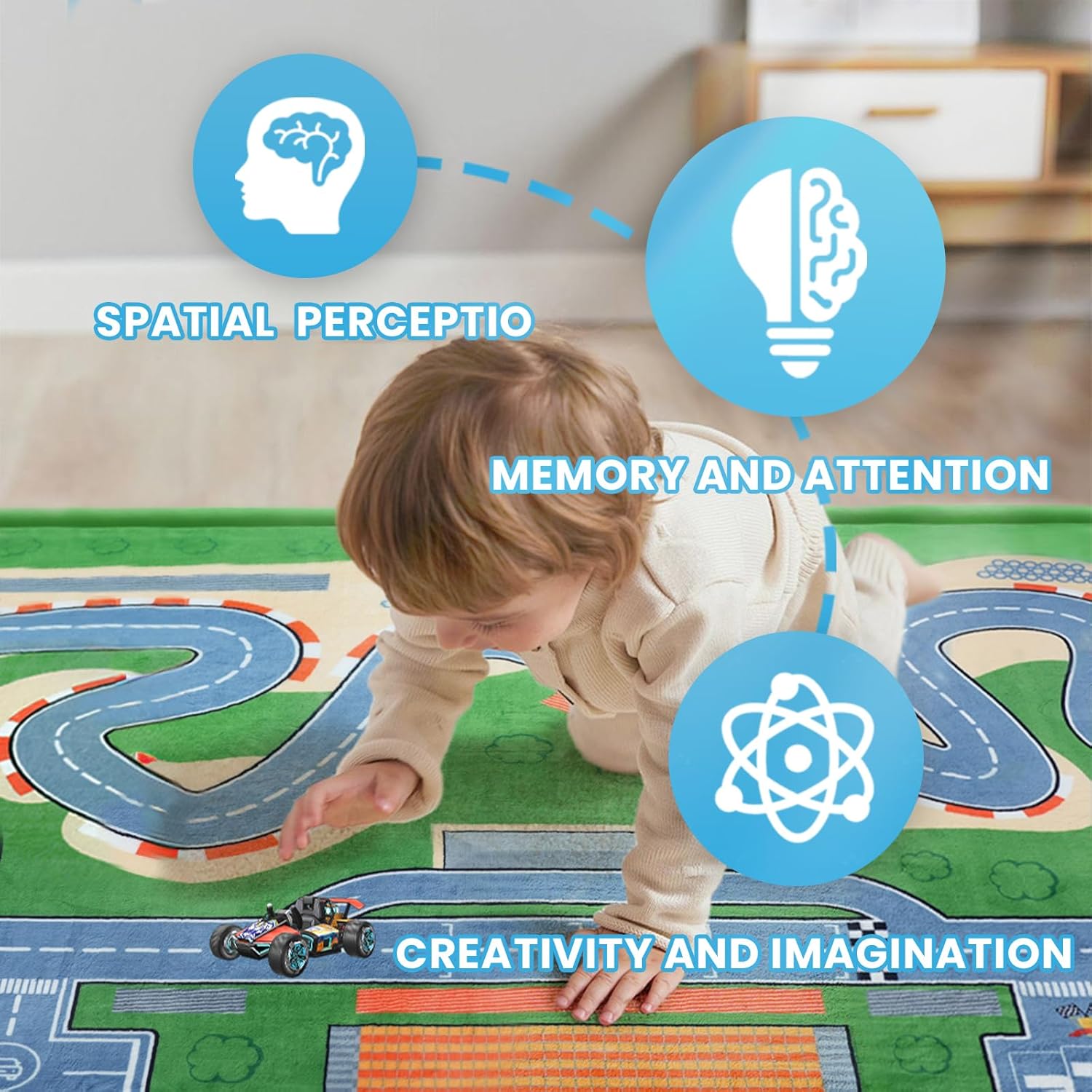 • Fun Educational Race Track Design: This vibrant car race track rug stimulates imagination and learning. Perfect as a classroom rug or playroom rug, it helps develop spatial awareness and creativity in toddlers and young children
