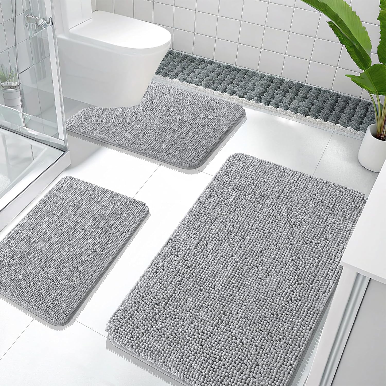 OLANLY Bathroom Rugs Sets 3 Piece, Soft Absorbent Chenille Bath Mats and U-Shaped Contour Toilet Rug, Quick Dry, Home Decor Accessories, Bath Mat Set for Bathroom (36"x24"+24"x16"+24"x20", Light Grey)