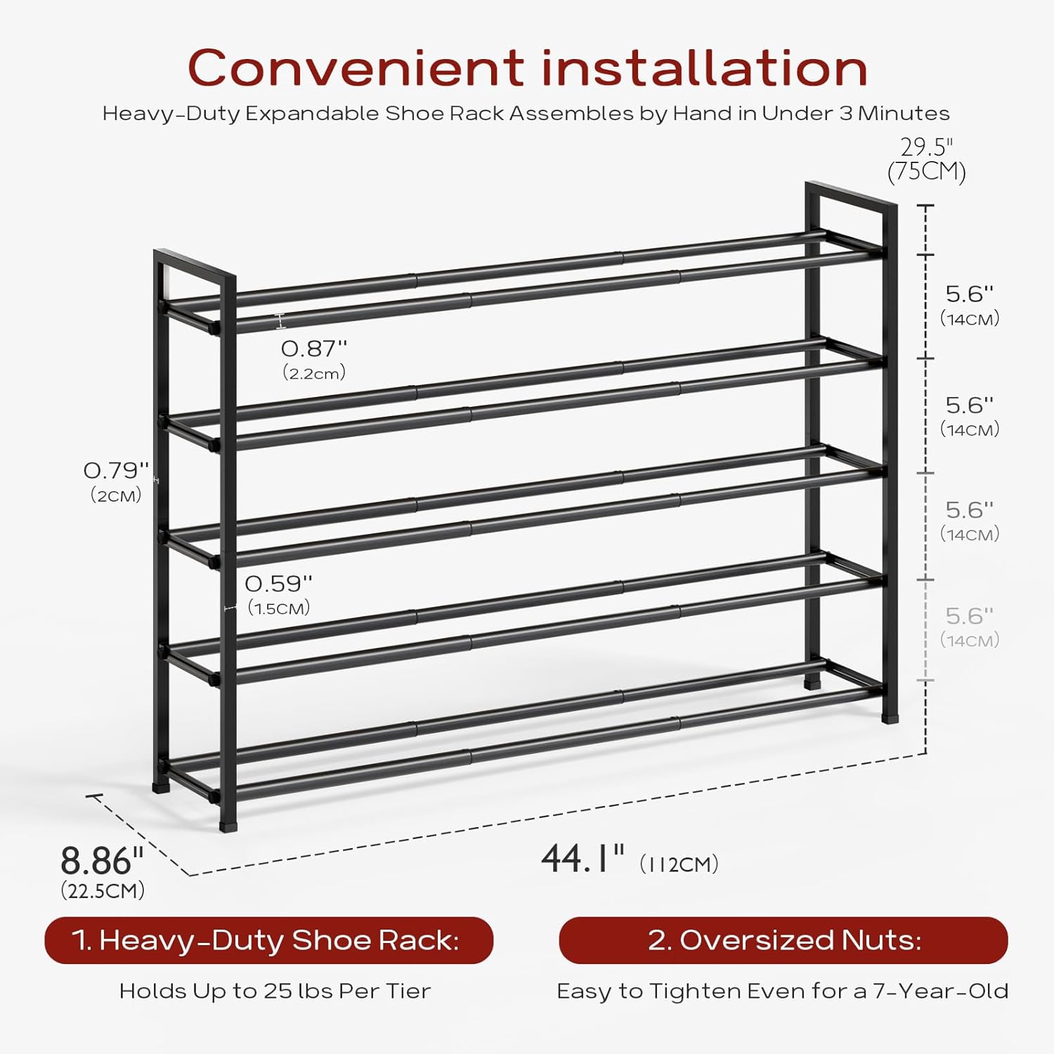 • 【Expandable Long Shoe Rack】Featuring a three-section telescopic design, this rack extends from 18 inches (45 cm) to 44 inches (112 cm), providing ample storage for up to 30 pairs of adult shoes.
