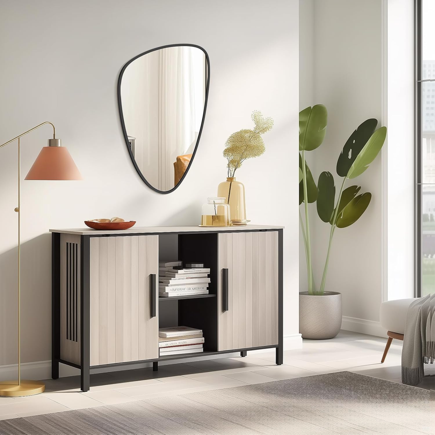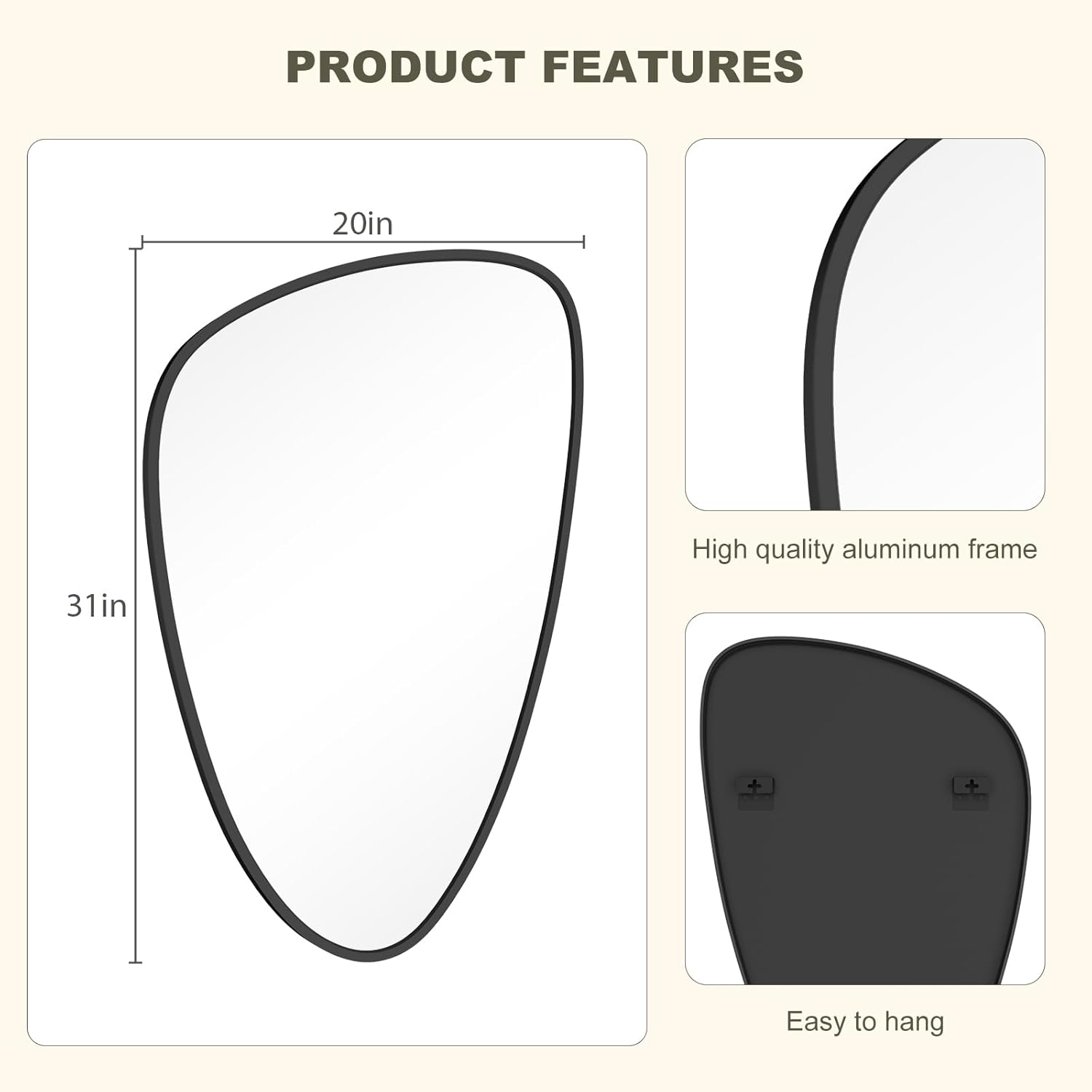 • Unique Asymmetrical Design: This Asymmetrical mirror features a distinctive irregular shape that adds an artistic touch to any space, seamlessly fitting into living rooms, bedrooms, hallways, dressing rooms, and various décor styles.