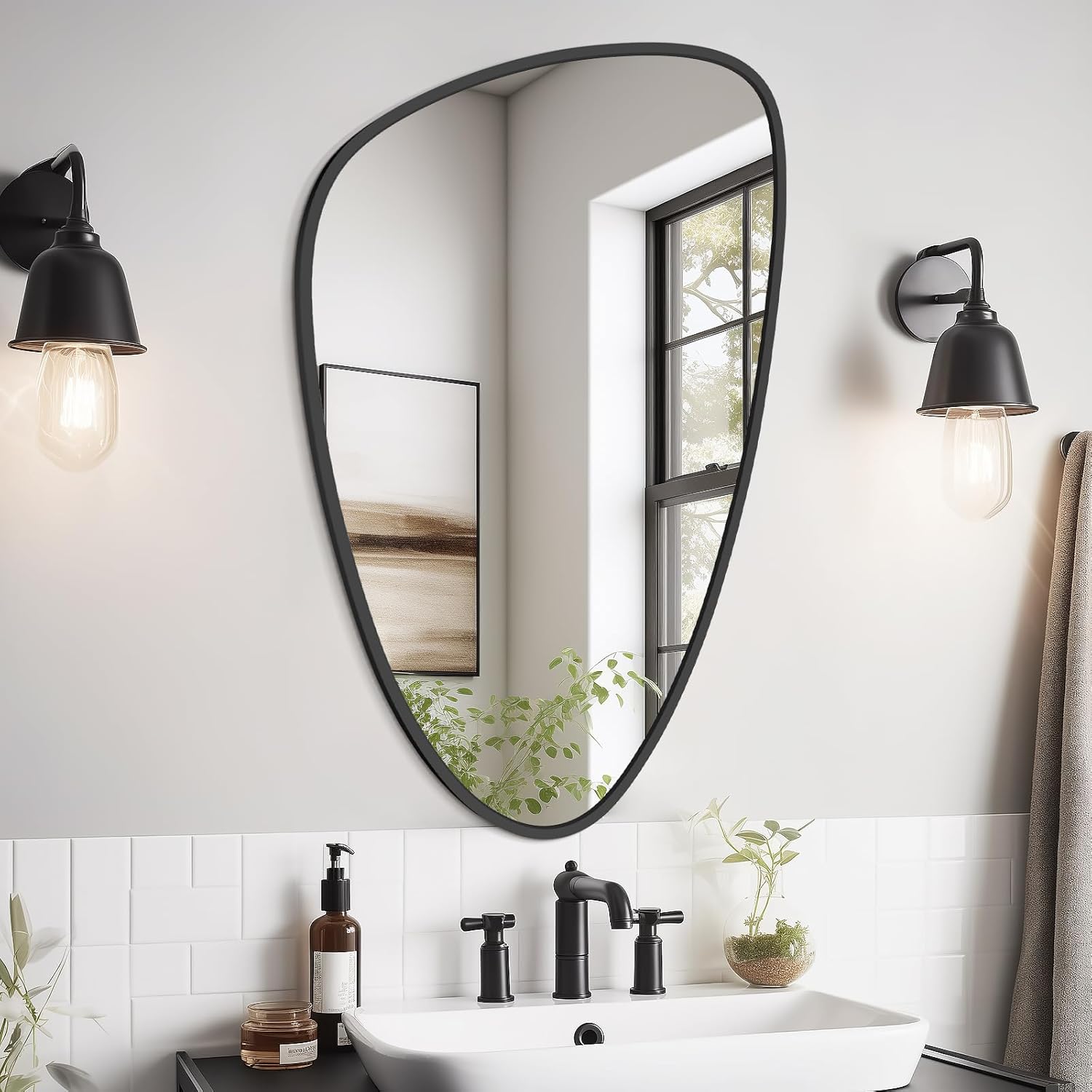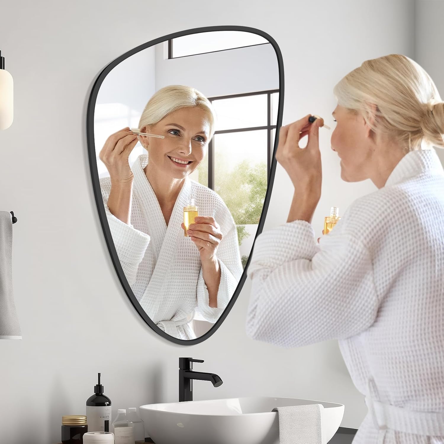 • Exquisite and Durable Aluminum Alloy Frame: The irregular bathroom mirror is framed with a robust aluminum alloy that is corrosion-resistant, non-toxic, eco-friendly, and odor-free. Its smooth, colorfast surface enhances both durability and modern aesthetic appeal.