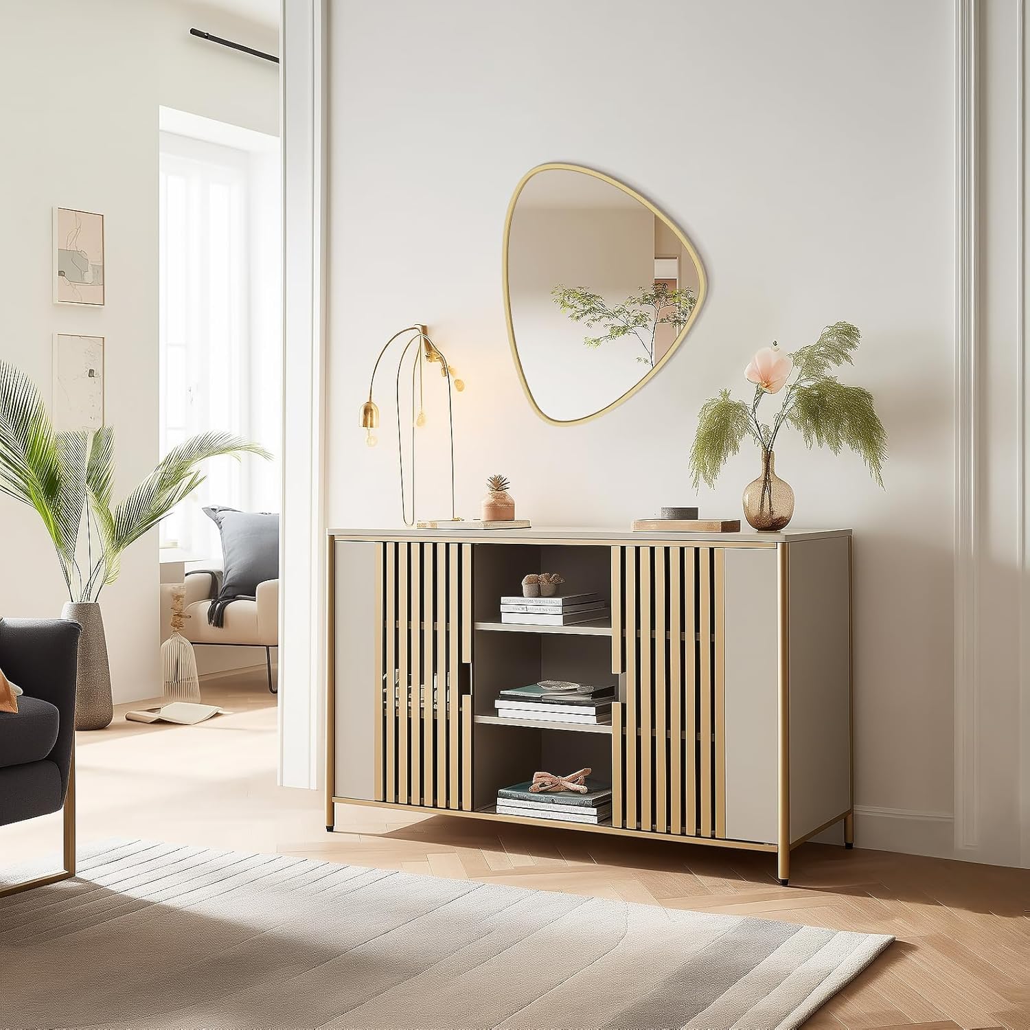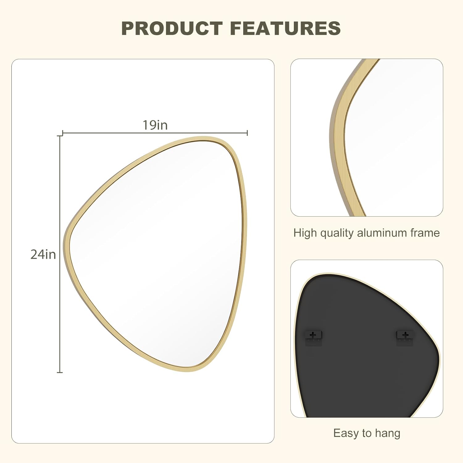 • Unique Asymmetrical Design: This Asymmetrical mirror features a distinctive irregular shape that adds an artistic touch to any space, seamlessly fitting into living rooms, bedrooms, hallways, dressing rooms, and various décor styles.