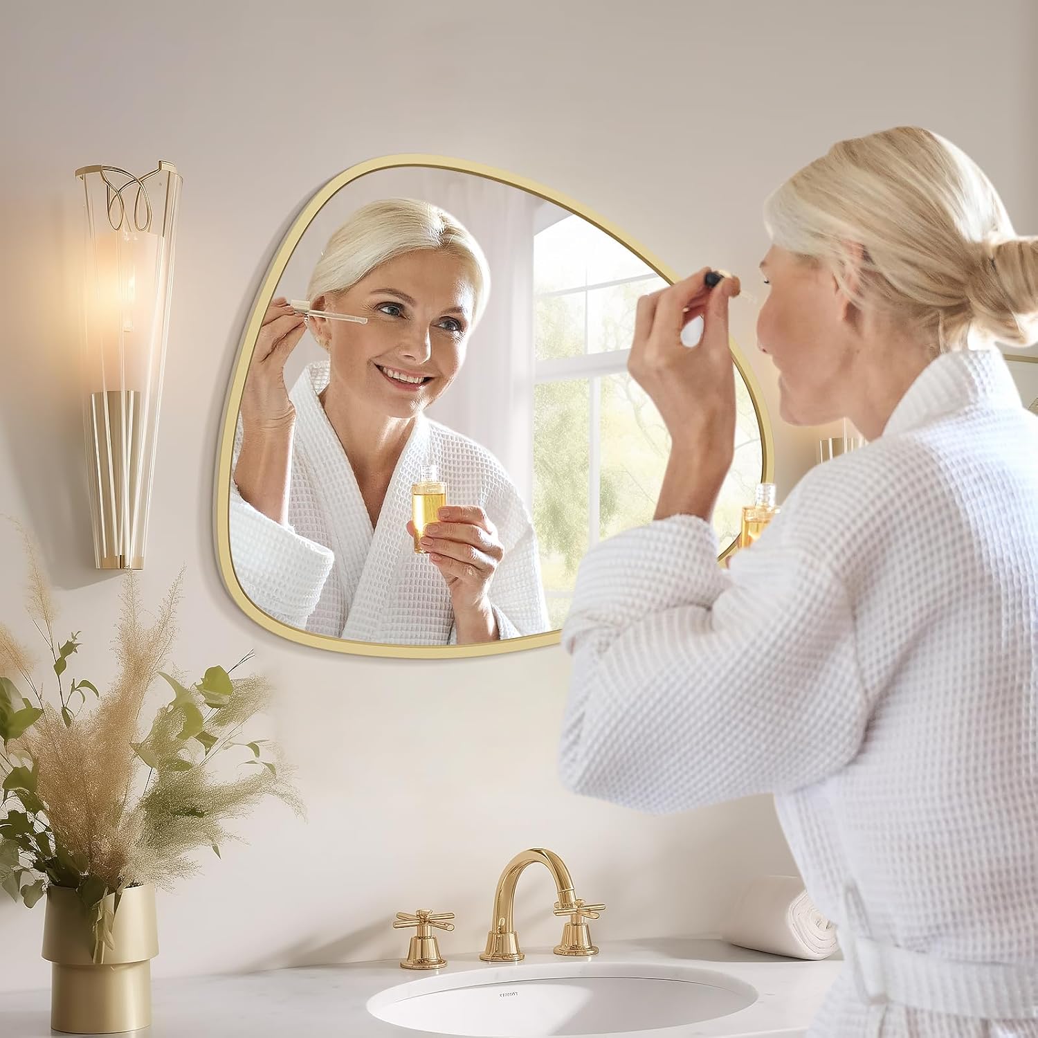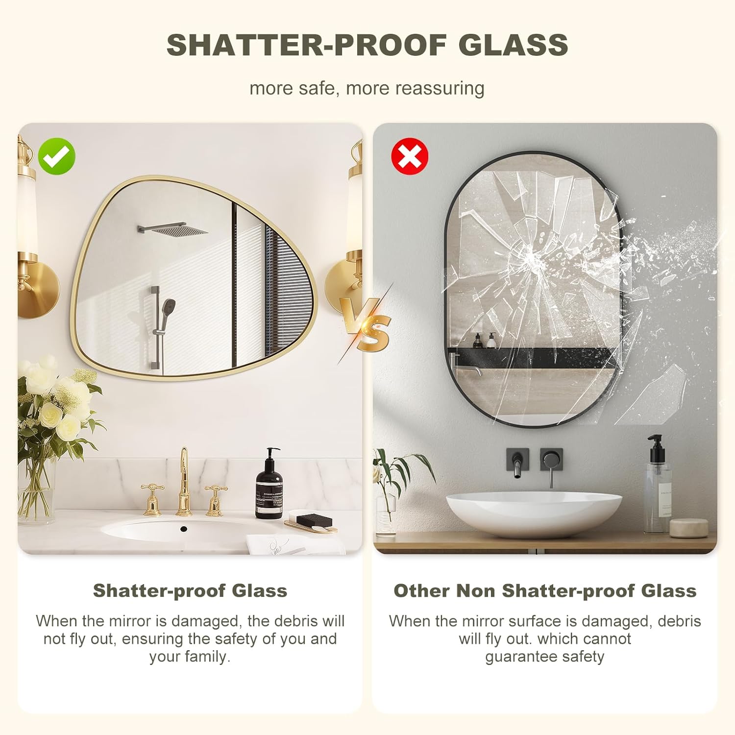 • Exquisite and Durable Aluminum Alloy Frame: The irregular bathroom mirror is framed with a robust aluminum alloy that is corrosion-resistant, non-toxic, eco-friendly, and odor-free. Its smooth, colorfast surface enhances both durability and modern aesthetic appeal.