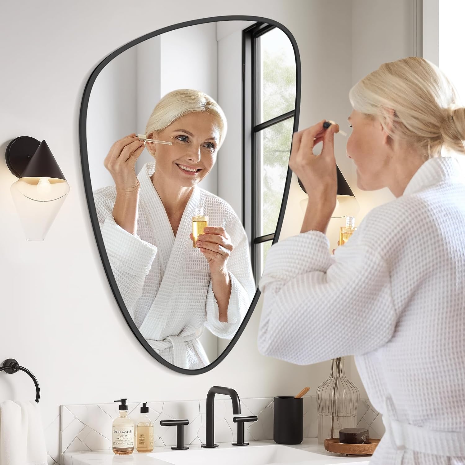 • Exquisite and Durable Aluminum Alloy Frame: The irregular bathroom mirror is framed with a robust aluminum alloy that is corrosion-resistant, non-toxic, eco-friendly, and odor-free. Its smooth, colorfast surface enhances both durability and modern aesthetic appeal.