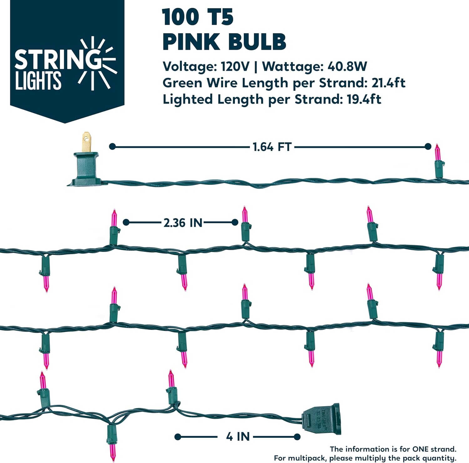 - Super Value Pack: Light up the upcoming Valentine's Day with pink lights through JOIEDOMI string lights.Our pink christmas lights have a total of 100 incandescent T5 bulbs with green wire. 40.8W 120V. Total Lighted Length is 19.5Feet. Total Wired Length is 21.5Feet. Bulb Spacing 2.36 inches.