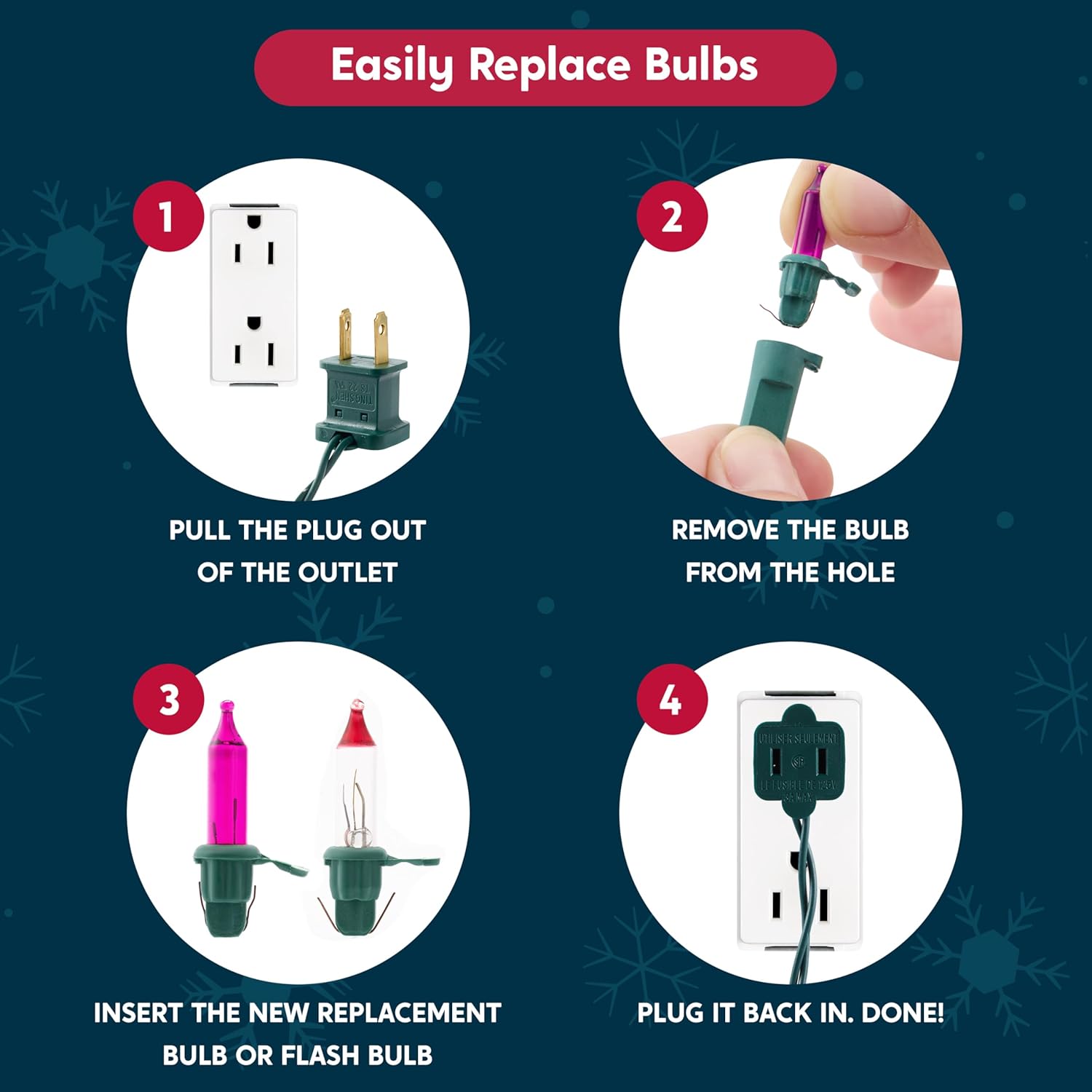 - Premium Quality. Our incandescent pink Christmas string lights are designed with strong durability to accommodate harsh weather conditions. Includes spare bulbs, flashes, and fuses. If one bulb burns out, the others stay lit.
