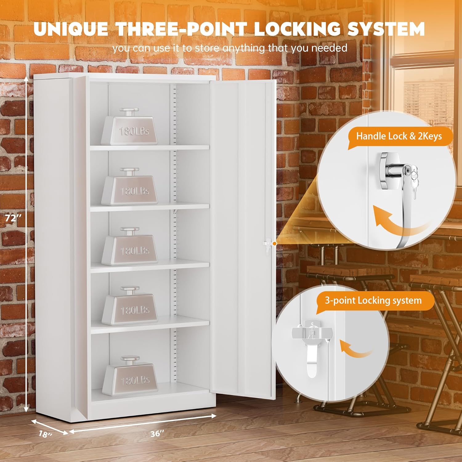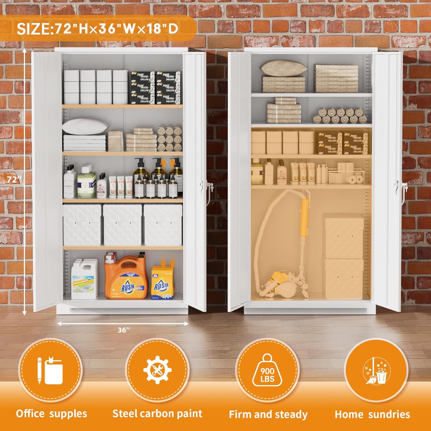 Greenvelly White Metal Cabinet, 72" H Steel Lockable Metal Storage Cabinet with 2 Doors and Adjustable Shelves,Tall Tool Organizer for Office,Home, Garage, Gym, School