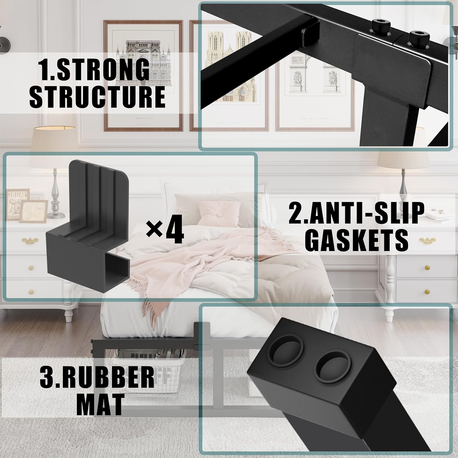 • Non-slip Design:The steel slats comes with four plastic mattress slide stopper reduce mattress slippage.The foot plug added to the bottom of the king platform bed frame support foot prevents the bed frame from sliding and protects your floor from being scratched.