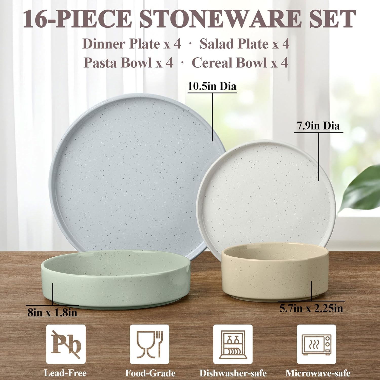 - Healthy and Sturdy Material, the stoneware set boasts a sturdy construction, crafted from natural clay and food grade glazes, fired at a high heat up to 2340°F for long-lasting use, chip and scratch-resistant, made of lead-free and cadmium-free materials, it ensures that your dining experience is safe without any harmful substances
