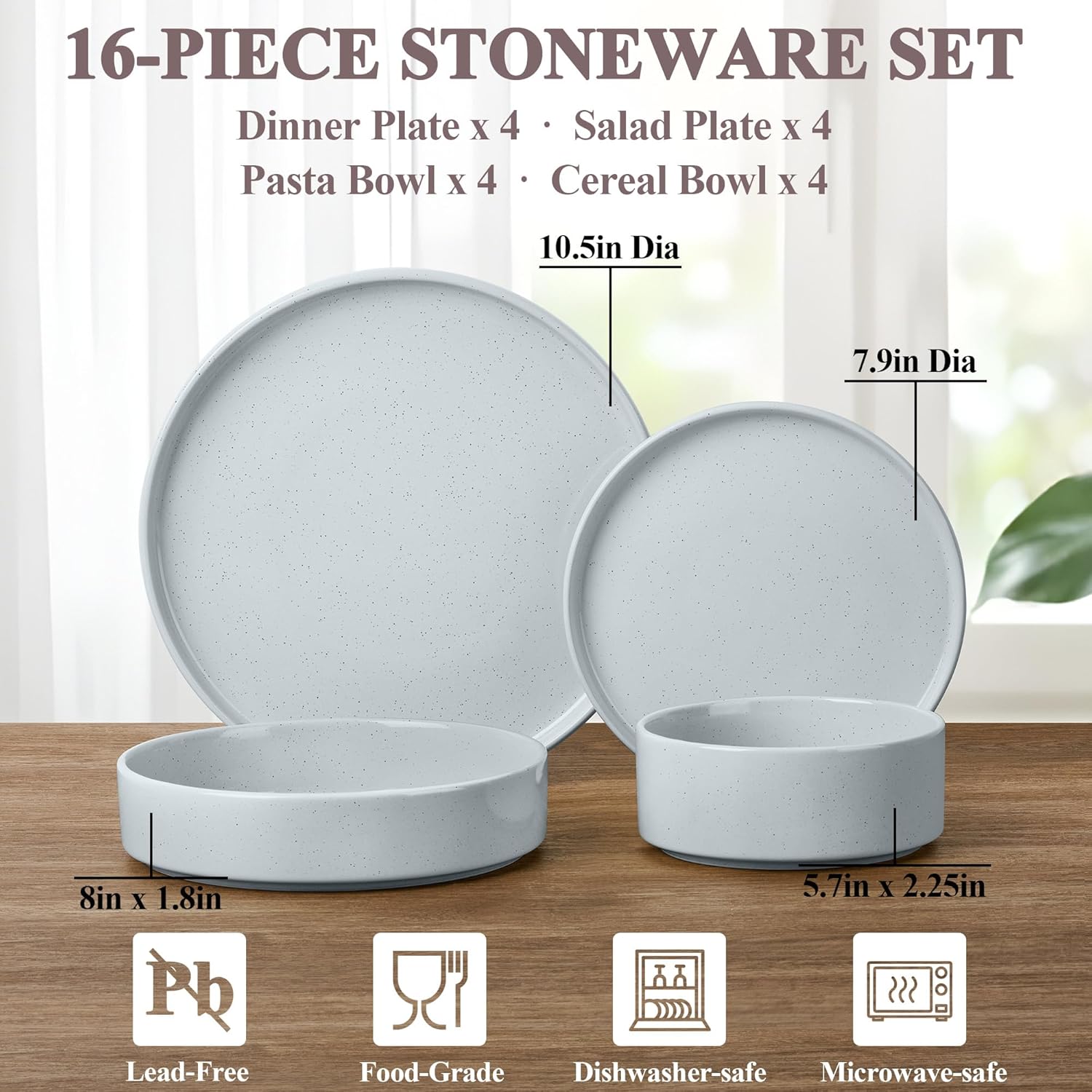 Herogo Stoneware Dinnerware Set with Salad Bowls, Kitchen Dinner Dish Set for 4, 16 Piece Plates and Cereal Pasta Bowls, Chip & Scratch Resistant Dishware, Speckled Light Gray