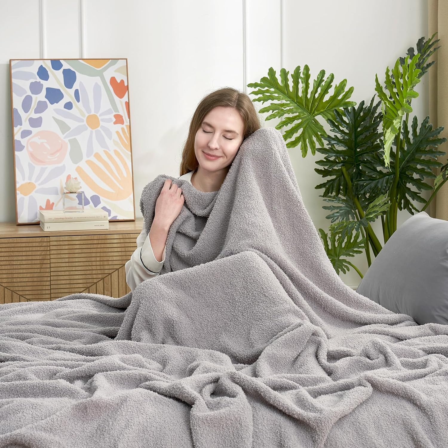 Snuggle Sac Grey Bedding Blankets Queen Size 90x90 inches, Reversible Microfiber Fluffy Fuzzy Soft Throw Cozy Knit Blanket for Women Mothers Birthday Gifts