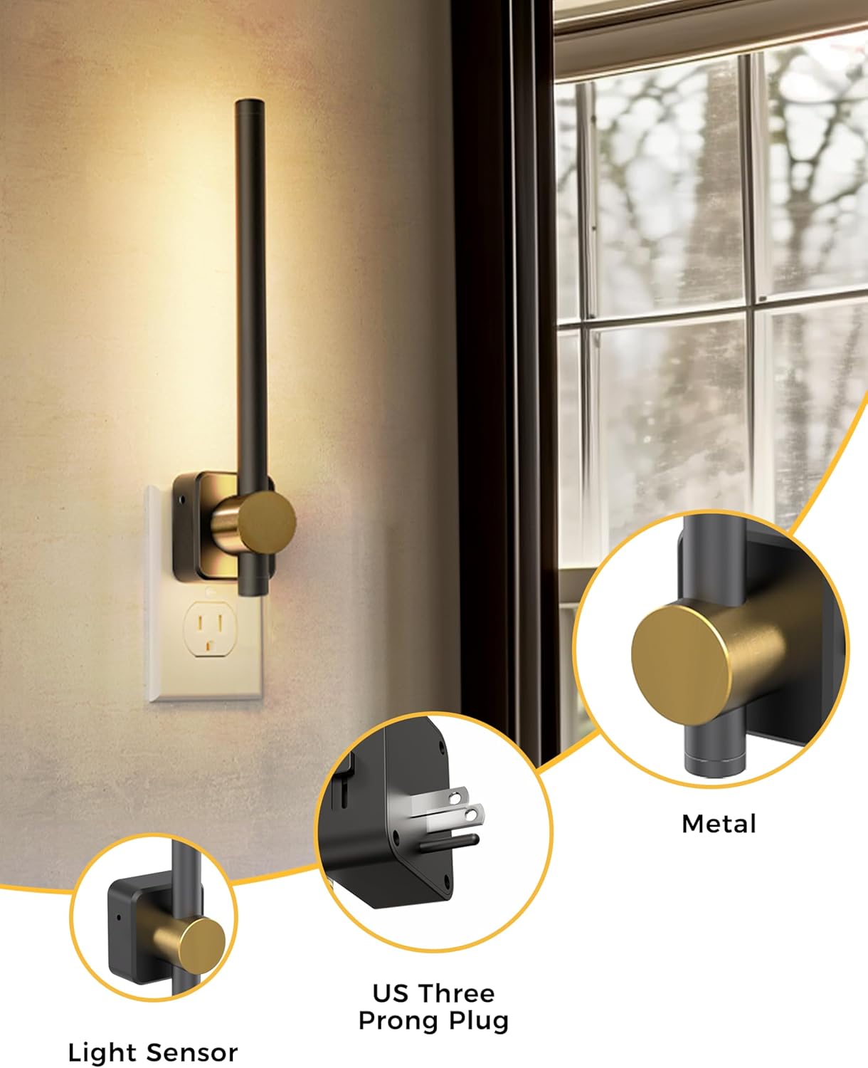 L LOHAS LED Night Light, Night Lights Plug into Wall, Dimmable Night Light 0-200LM, Nightlight Black and Gold Vanity Light Bar for Bathroom Bedroom, Soft White 3000K, Dusk to Dawn Sensor, 1Pack