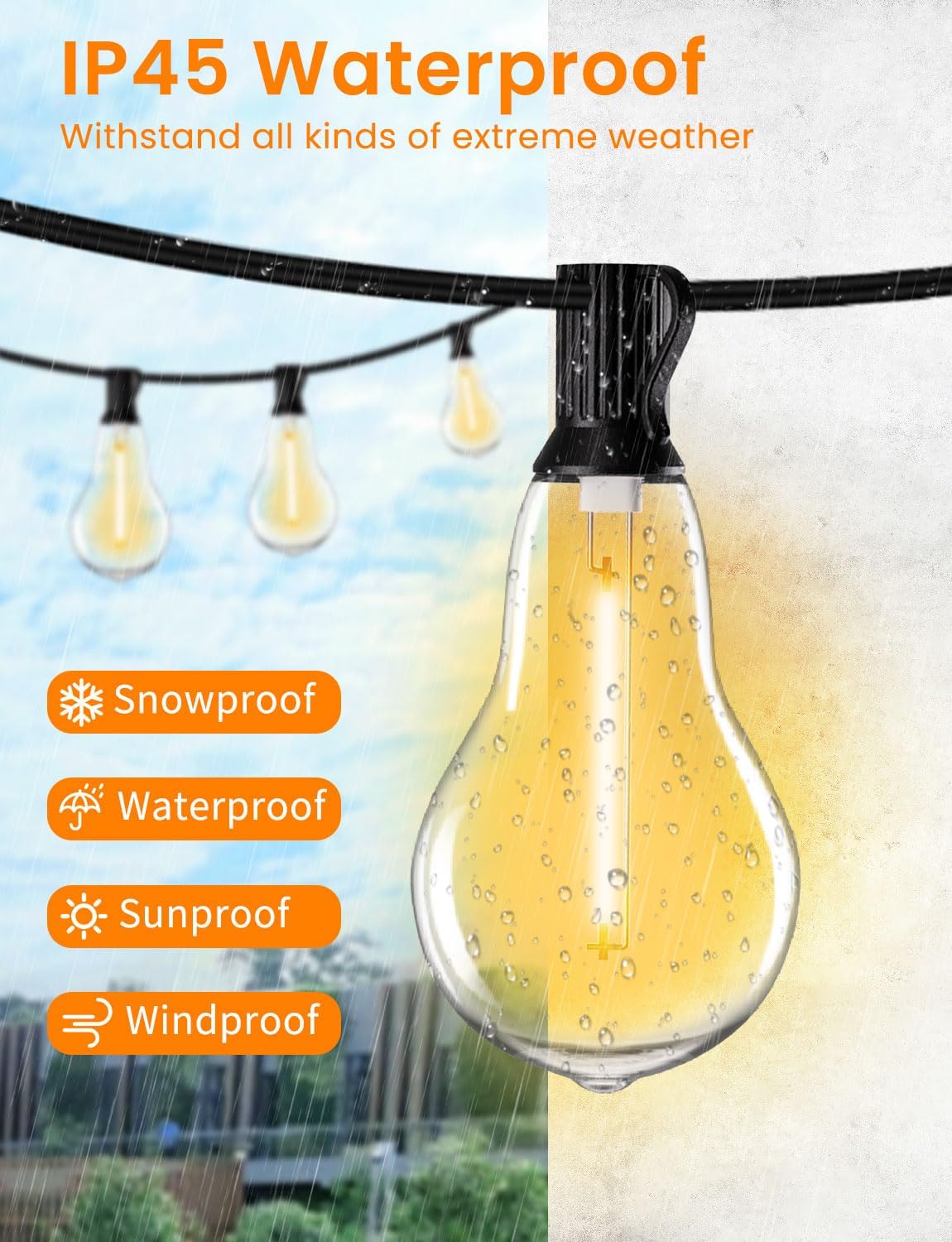 - 【Waterproof and Shatterproof Outdoor String Lights】: Our outdoor lights for patio posts are IP45 waterproof, and even in rainy, snowy days, these exposed hanging lights for outside will still give you reliable lighting. The casing of the Edison lights bulbs is made of shatterproof plastic. Patio string lights with plastic bulbs are more durable and less likely to break than regular bulbs.