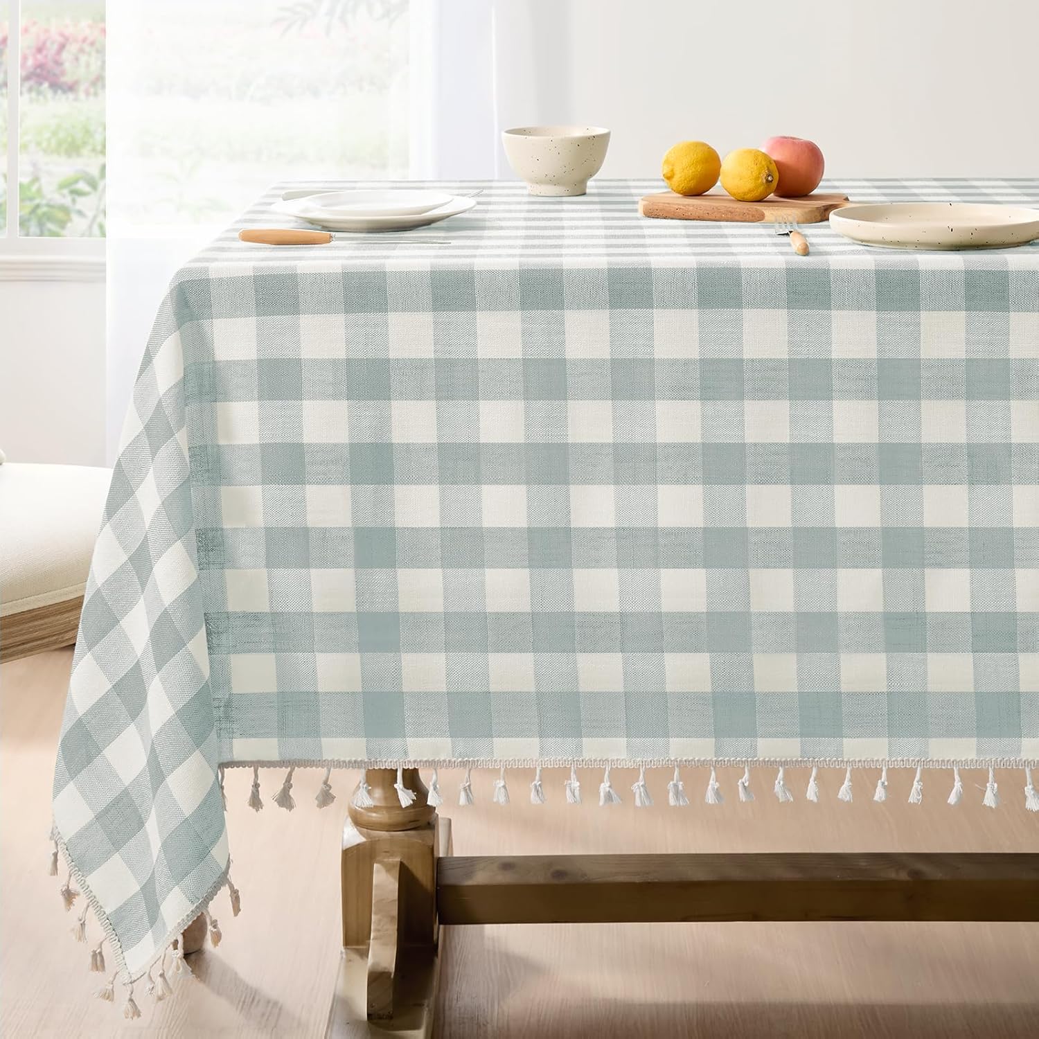 • CLASSIC GINGHAM TABLECLOTH WITH TASSELS: Featuring the timeless aqua and white buffalo check pattern with playful tassel fringe, this tablecloth blends rustic, farmhouse charm and modern elegance to create a cozy, inviting dining atmosphere.