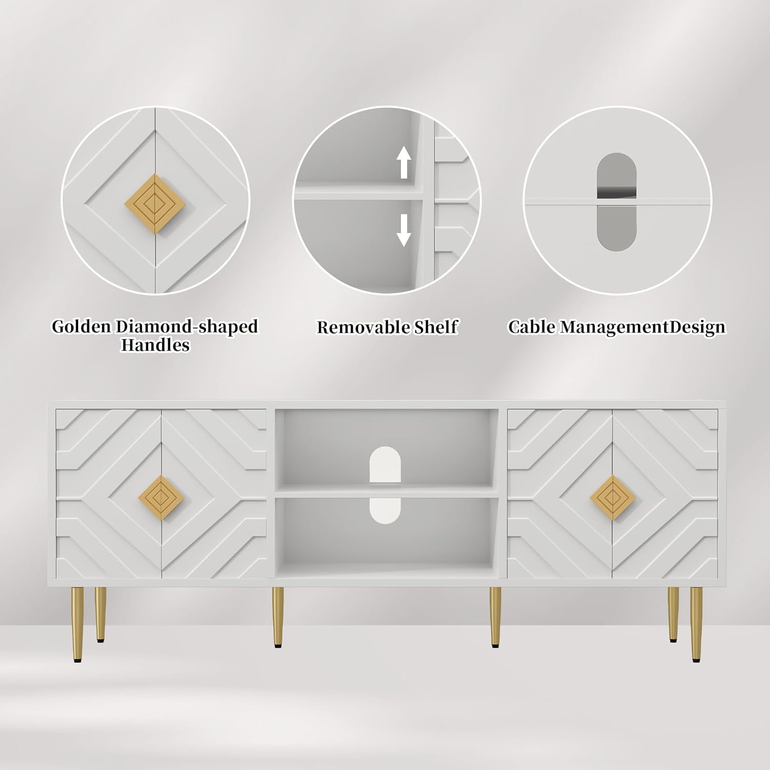 - 【Spacious Storage TV console】 With 2 spacious cabinets and middle storage shelf, this media console is ideal for additional storage in your home. The top of this TV stand can also hold display items. The removable shelf allows for larger space options, it is perfect to store daily goods and small appliances.