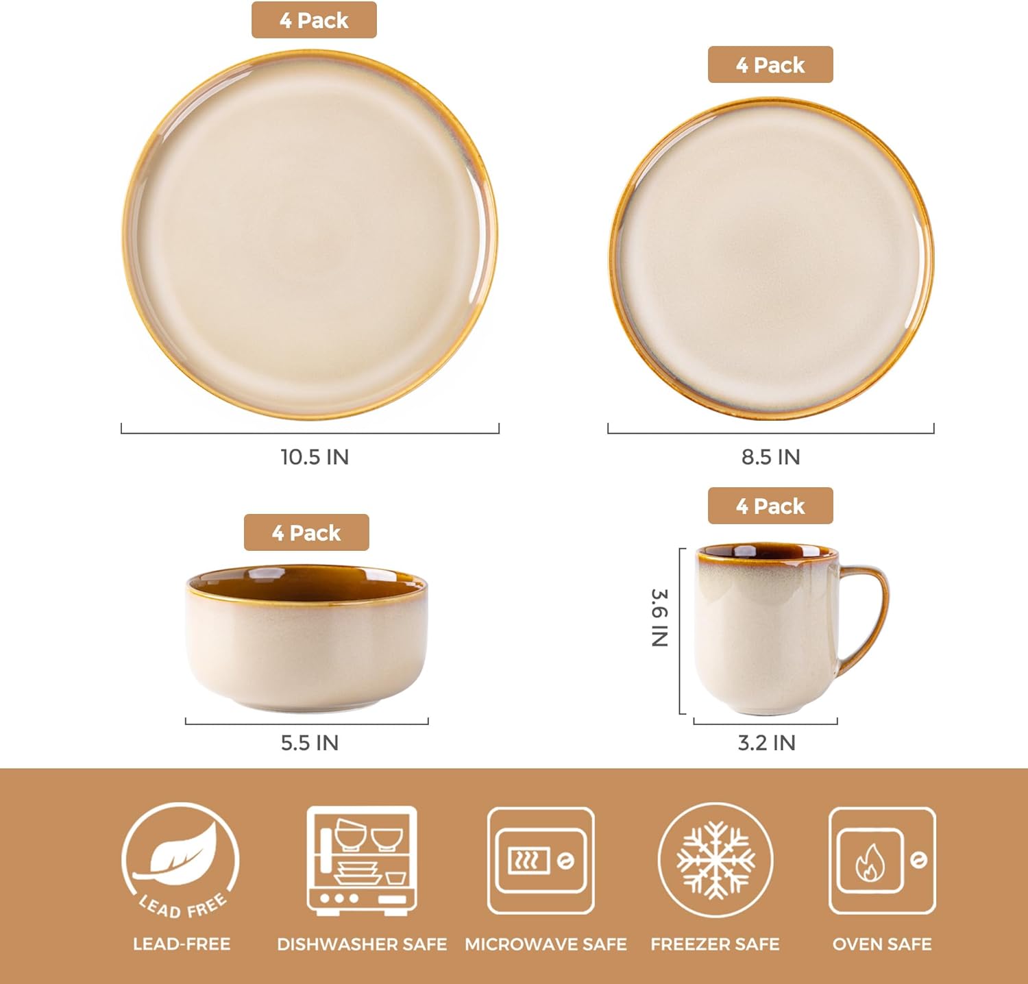 - 【WHAT YOU WILL RECEIVE】 This 16-piece dinnerware set includes 4 x 10.5-inch dinner plates, 4 x 8.25-inch salad plates, and 4 x 24 oz cereal bowls,4X 12oz Coffee mugs. Ideal for small families, couples, or individuals, this set perfectly meets all your dining needs with four complete place settings.