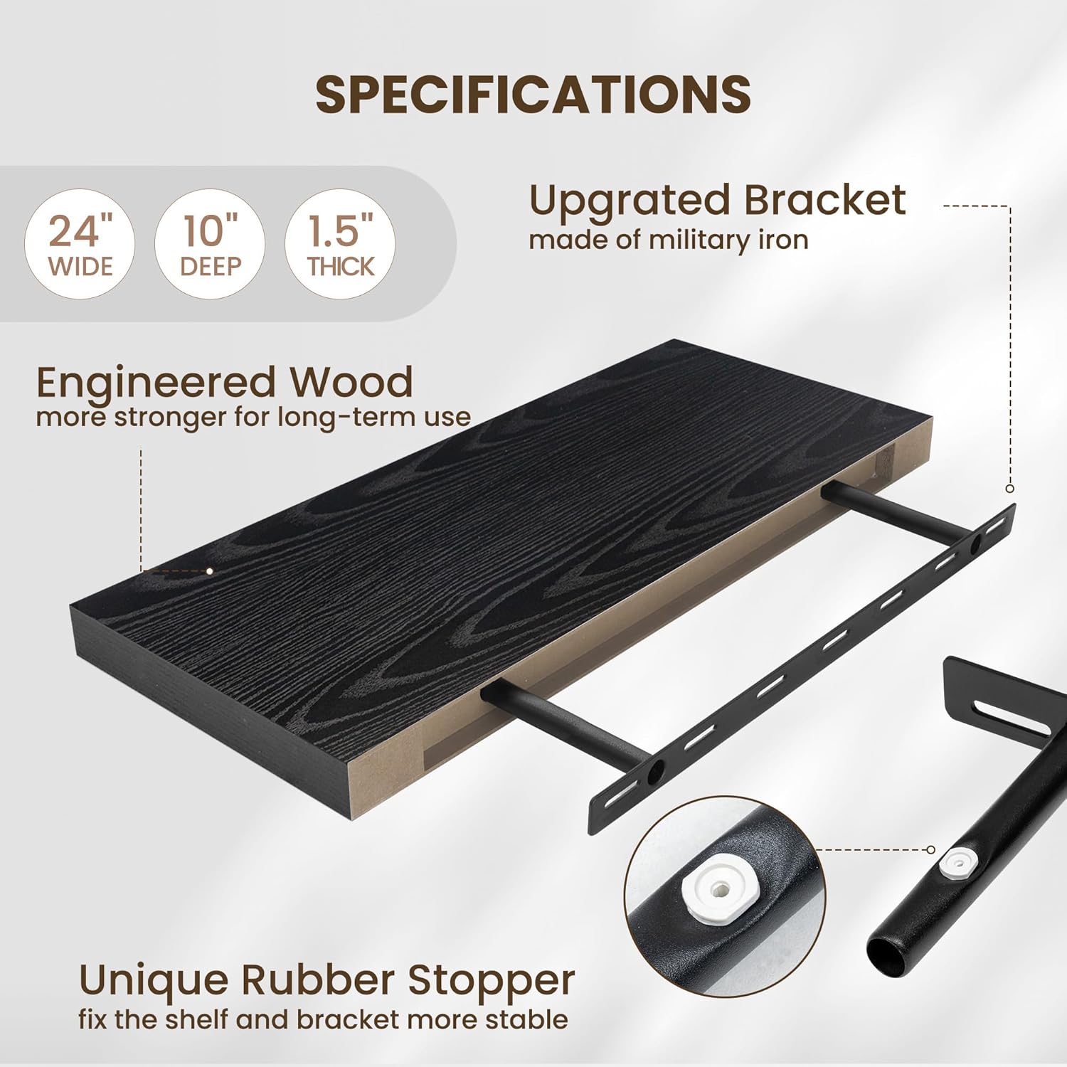 Fun Memories 24 Inch Floating Shelves Wall Mounted, 10 Inch Deep Wall Shelves, 24 x 10 Floating Shelf for Living Room Bathroom Bedroom, Black, Set of 2