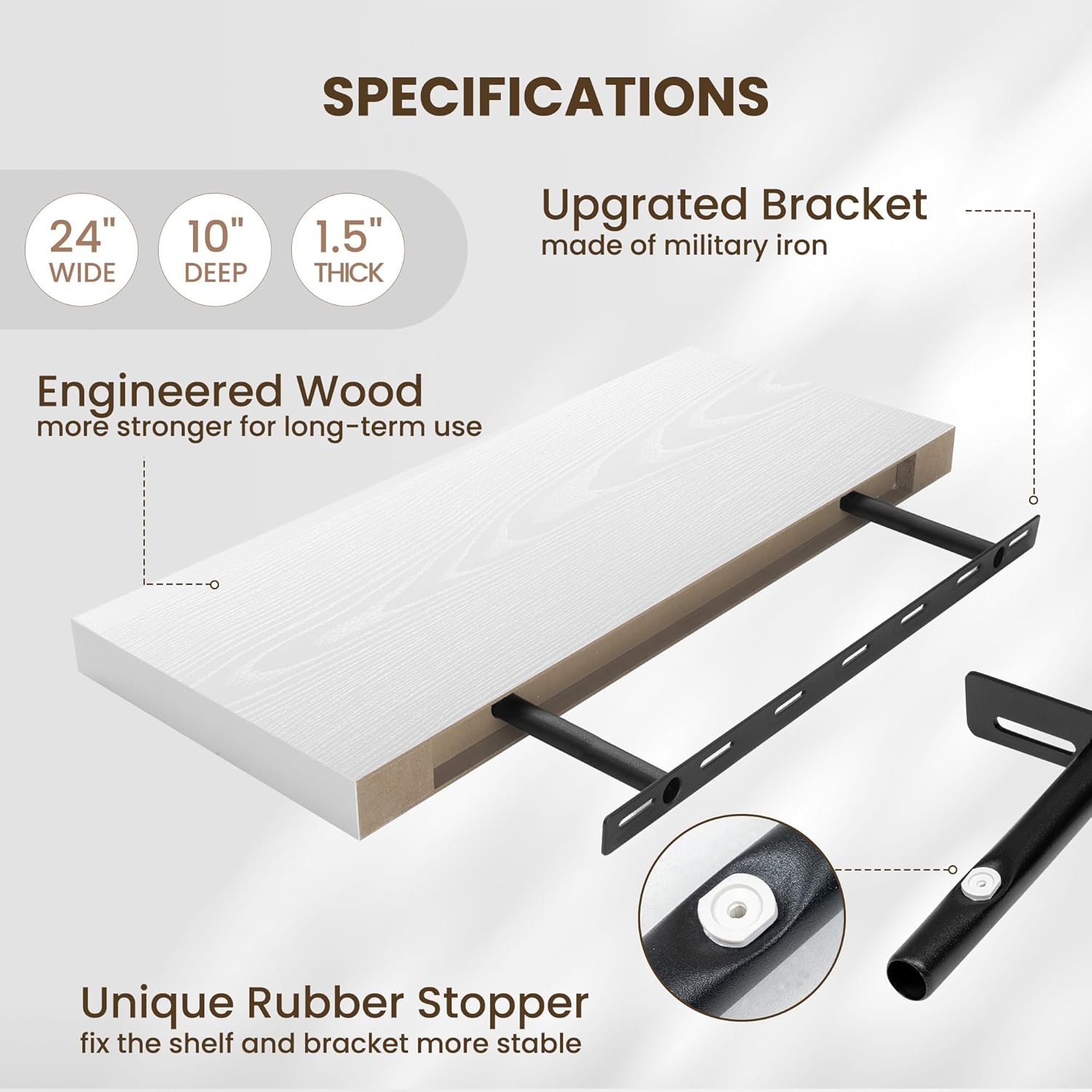 - INVISIBLE & STURDY BRACKET: This floating shelf features a simple and elegant design with an invisible bracket that creates a floating effect. The sturdy hidden support and special rubber stoppers ensure the shelf stays firmly in place, offering both strength and a clean, modern style