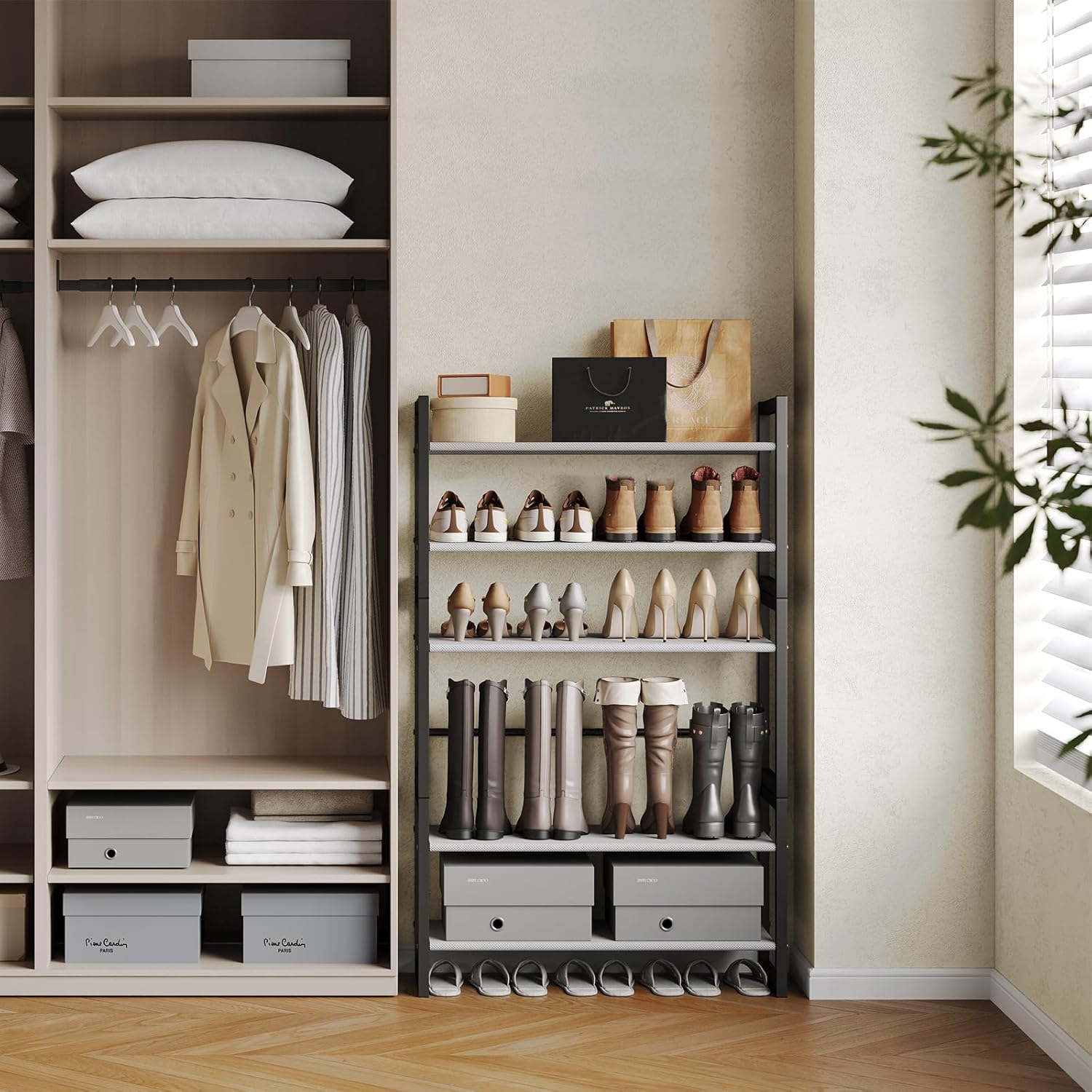 - ✅Multifunctional Shoe Rack: The 6 tier shoe shelf size is 28.74”L x 7.01”D x 47.02”H, perfect for entryways, garages, dorm rooms, bedrooms, living rooms, small spaces, and hallways, offering stable and attractive storage across various home settings