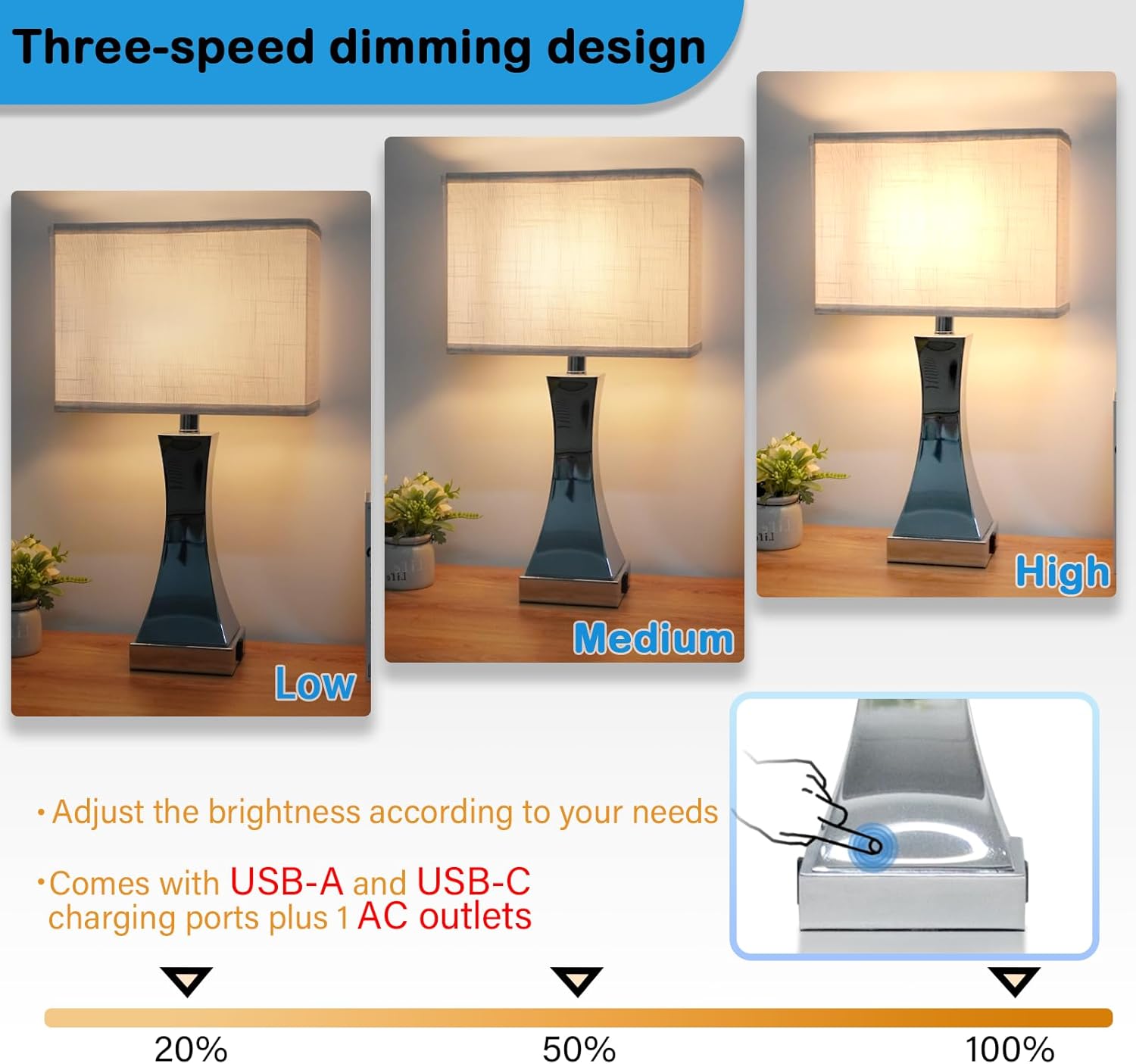 - 【3-WAY DIMMABLE TOUCH CONTROL TABLE LAMP】Simply tap anywhere on the table lamp metal to control the bedside table lamp (low, medium, high, off). It works great when you're sleeping and saves you the trouble of looking for the switch in the dark
