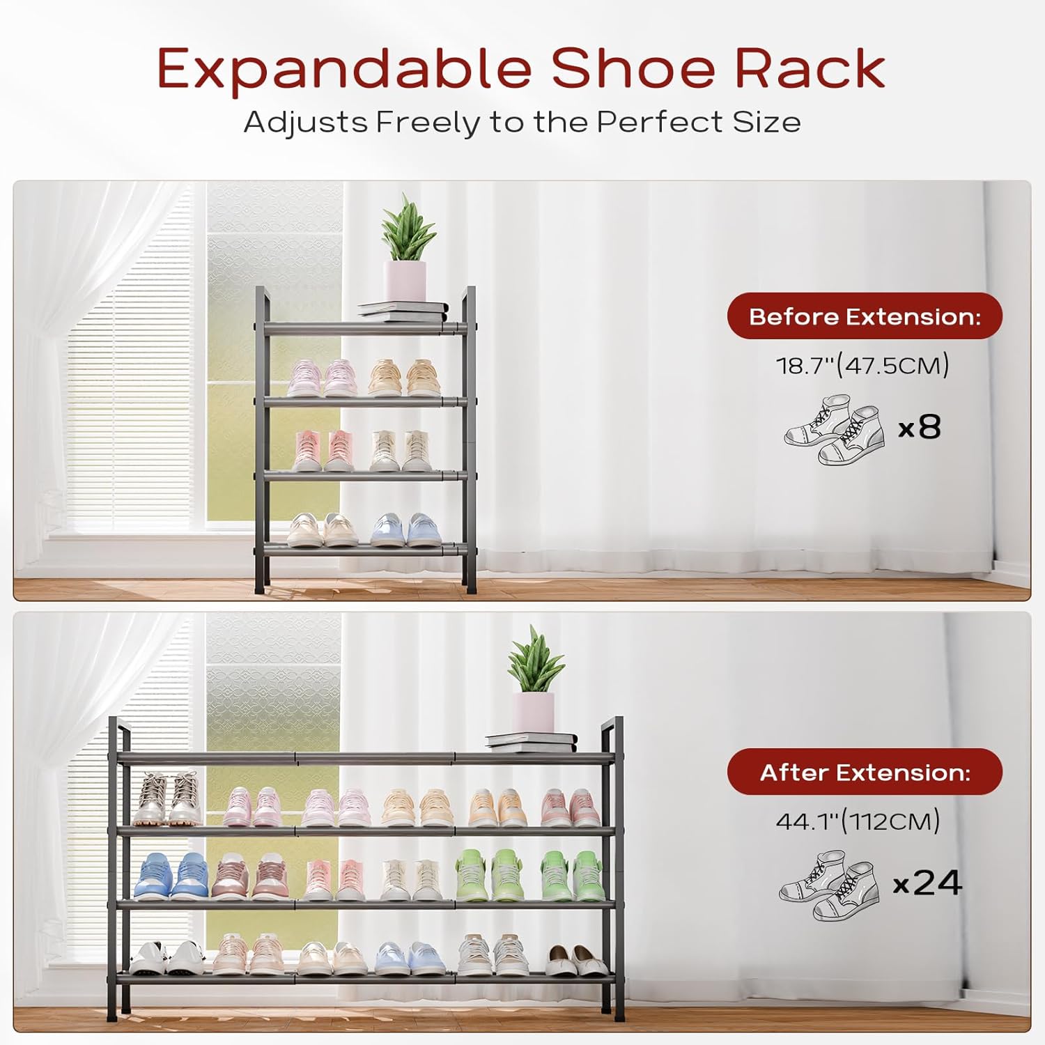 • 【Expandable Long Shoe Rack】Featuring a three-section telescopic design, this rack extends from 18 inches (45 cm) to 44 inches (112 cm), providing ample storage for up to 24 pairs of adult shoes.