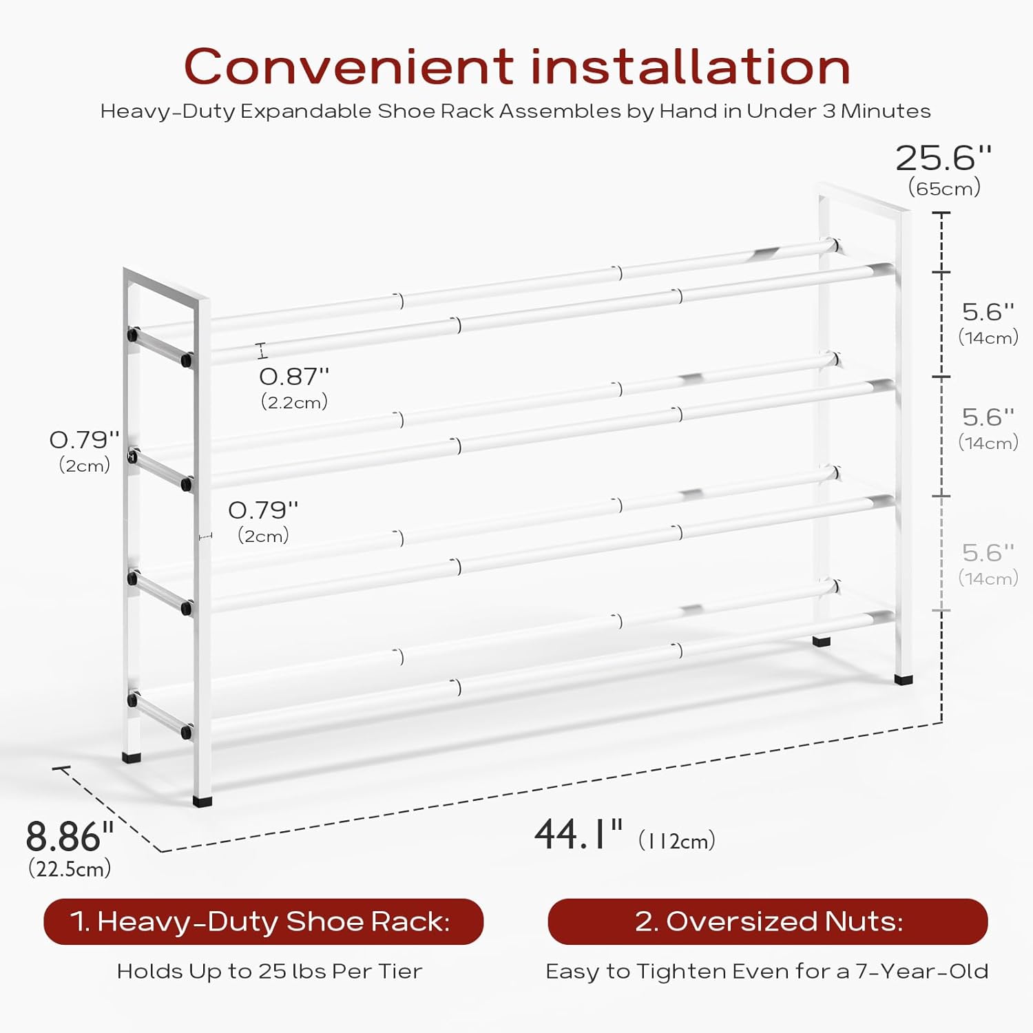 Bumusty 4-Tier Long Expandable Shoe Rack for Closet, 18"-44" Adjustable Shoe Rack for Entryway, 20-24 Pairs Large Shoe Organizer Shelf Storage, Sturdy Metal, White
