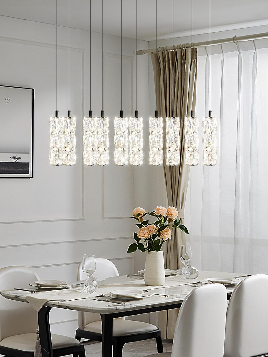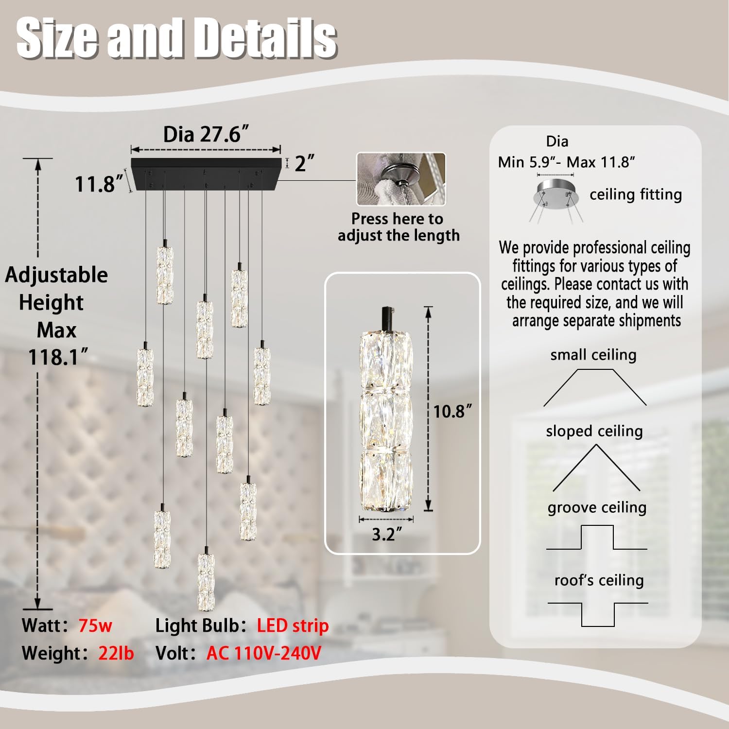 • 【Modern Crystal Chandelier Size】:10-Light Crystal Pendant Light. Lamp Body size: W3.2",H10.8". Ceiling canopy :W11.8" x L27.6" x H2". Height 118"(MAX)