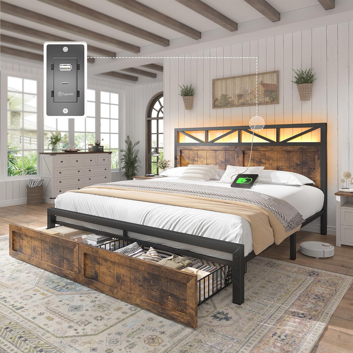 EnHomee Queen Metal Bed Frame with 2 Storage Drawers, Built in Charging Station & LED Light,NO Noise,No Box Spring Needed,Rustic Brown