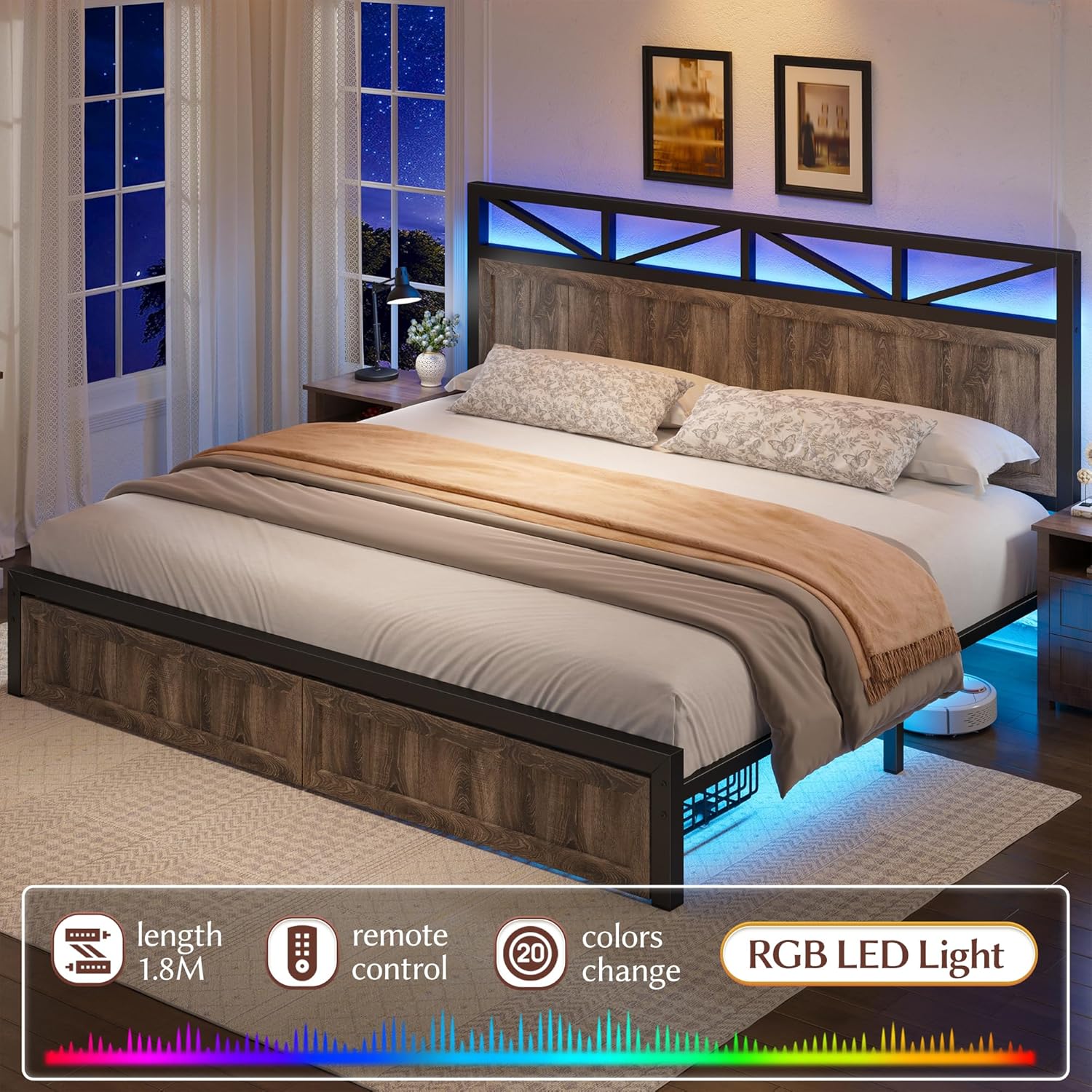 - 【Smart LED & Charging Station】This King bed frame with headboard comes with an RGB LED light strip. Use the remote control to adjust the color, brightness and mode.The platform bed frame King size also comes with 2 charging port, so you can easily charge all your electronic devices right from your bed. Making your home life more vibrant and convenient.