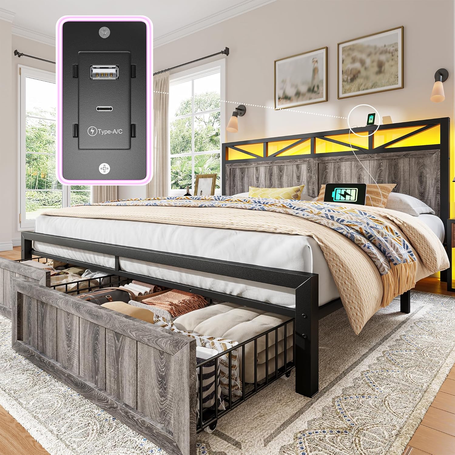 EnHomee King Size Bed Frame with 2 Storage Drawers, King Bed Frame with Wooden Headboard and Strong Metal Support,LED Lights and Charging Station,Farmhouse,NO Noise,No Box Spring Needed,Grey