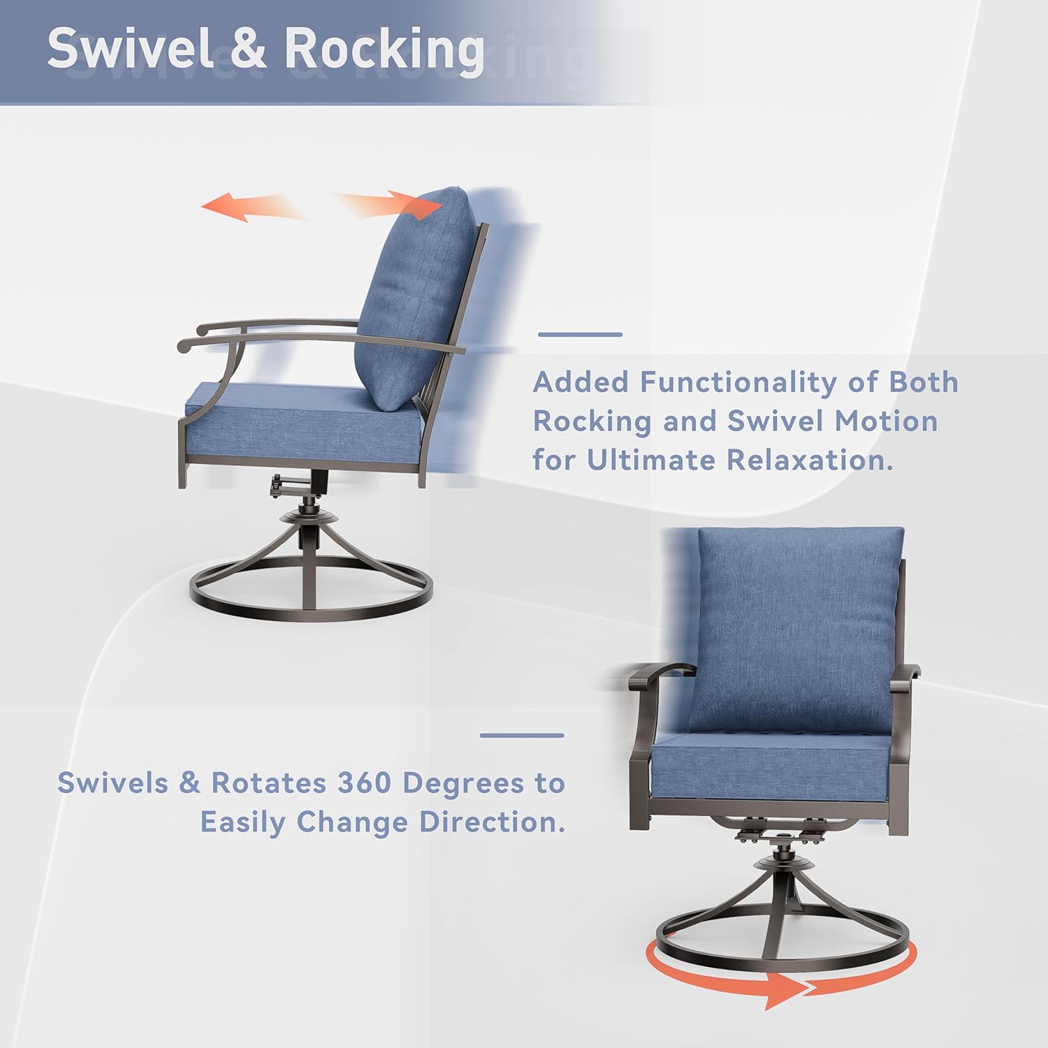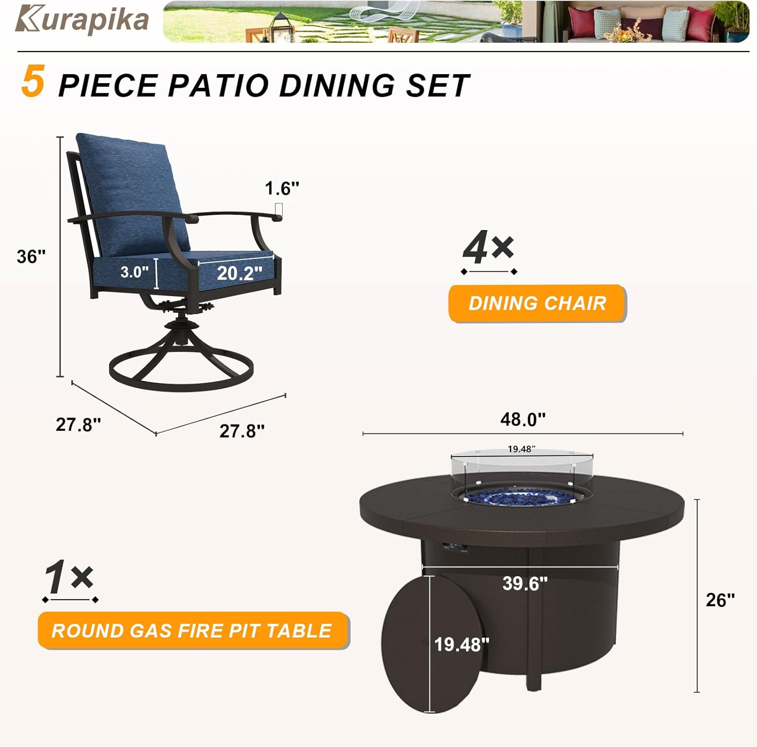 Kurapika 5 Piece Metal Outdoor Patio Furniture Set with Round Fire Pit Table, Patio Conversation Sets 4 Swivel Chairs with Thick Cushion and 40000 BTU Fire Pit Table, Navy Blue
