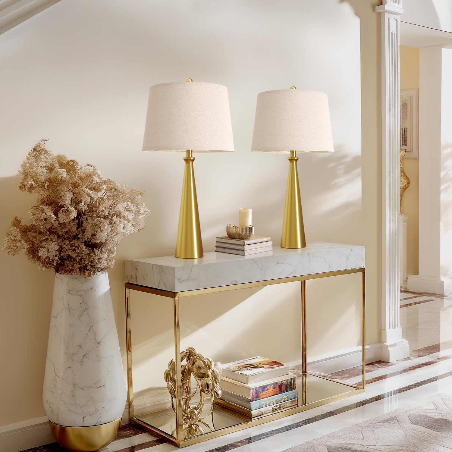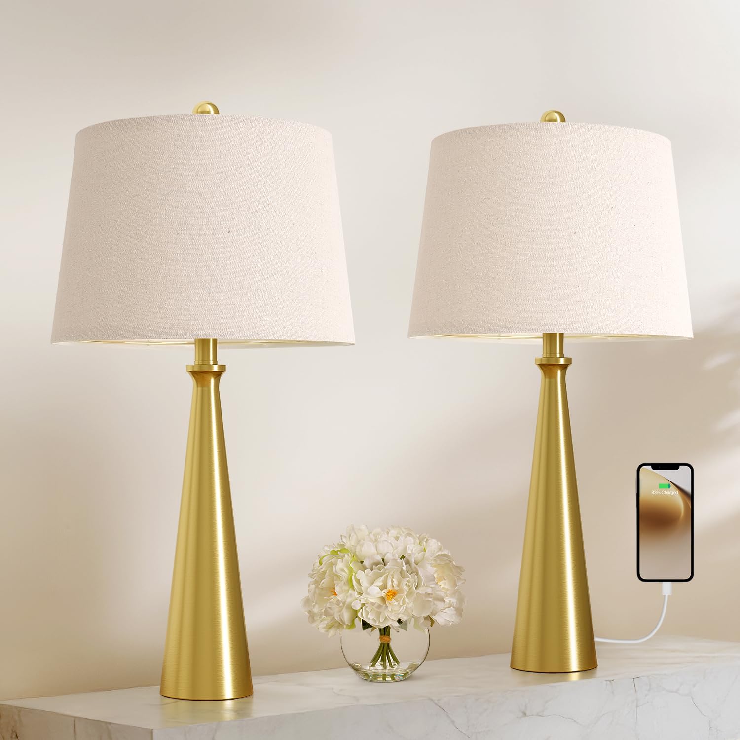 Oneach 25.75" Modern Table Lamp Set of 2, Bedside Lamps with USB Ports, Brass Gold Nightstand Lamps Set for Living Room Bedroom House Bedside Home Office Family