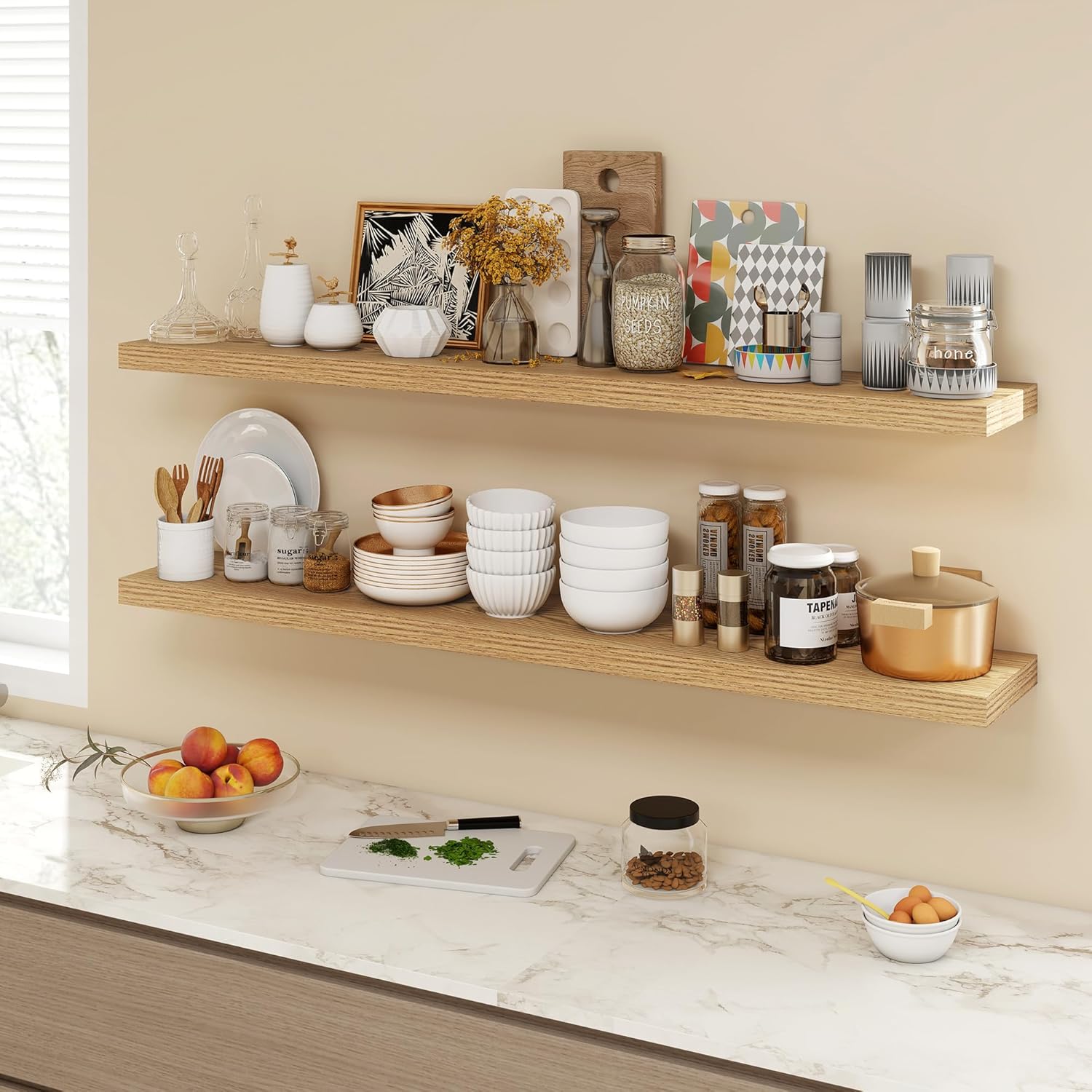 - [OPTIMIZE YOUR SPACE]: Ideal for small apartments, kitchens, and compact living areas, these floating wall shelves free up floor space. They create an illusion of a larger room, allowing you to store and showcase plants, collectibles, and other decor without sacrificing valuable floor area.