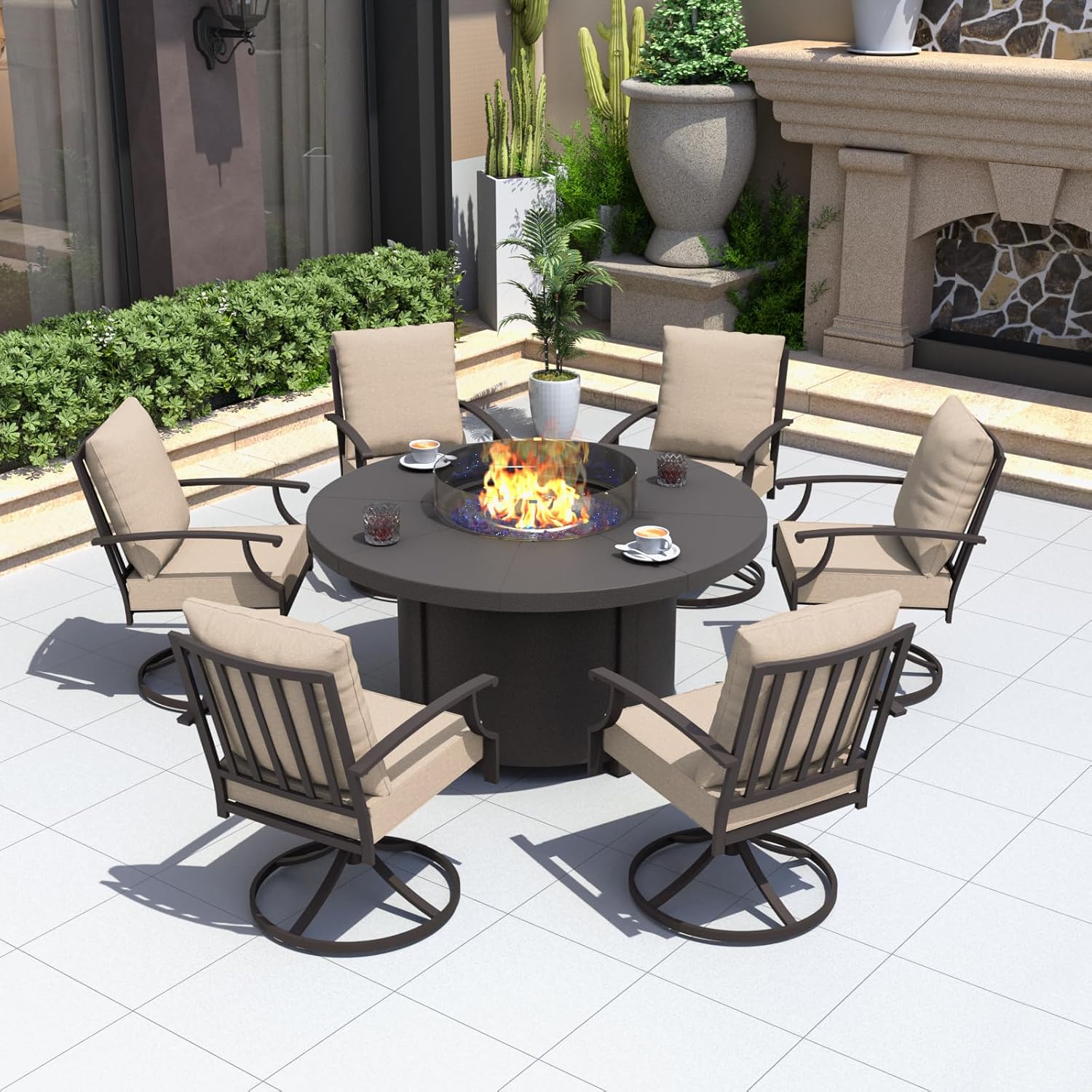 Kurapika 7 Piece Metal Outdoor Patio Furniture Set with Round Fire Pit Table, Patio Conversation Sets 6 Swivel Chairs with Thick Cushion and 40000 BTU Fire Pit Table, Sand