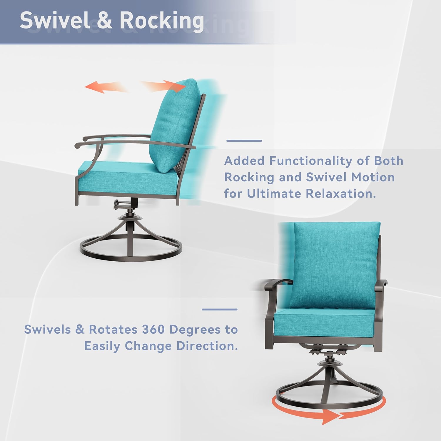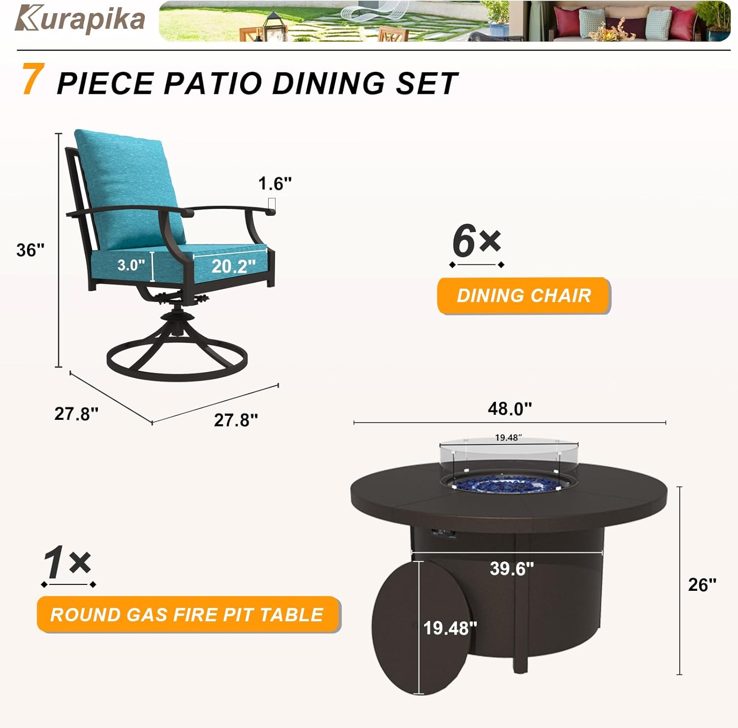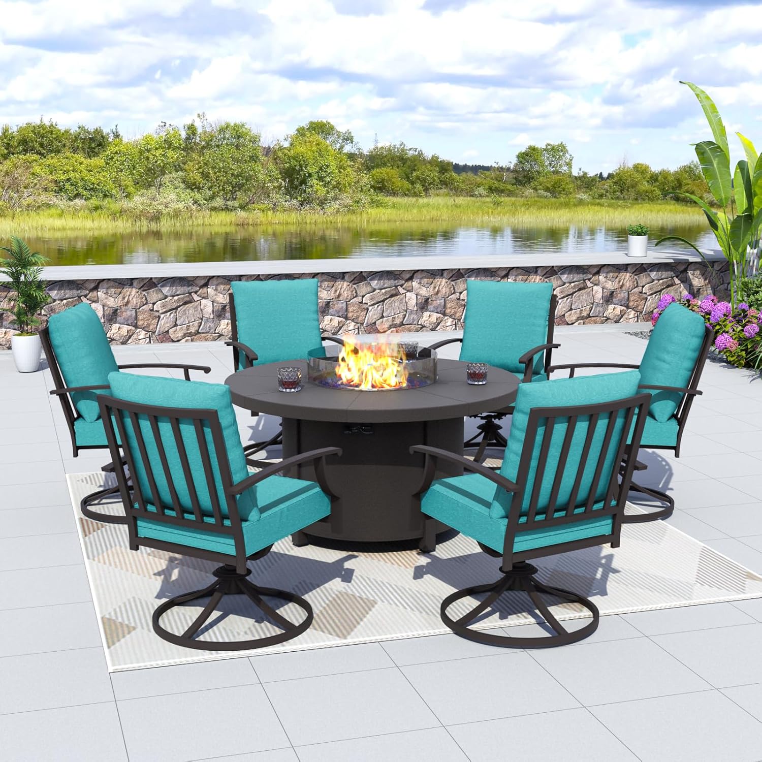 Kurapika 7 Piece Metal Outdoor Patio Furniture Set with Round Fire Pit Table, Patio Conversation Sets 6 Swivel Chairs with Thick Cushion and 40000 BTU Fire Pit Table, Blue