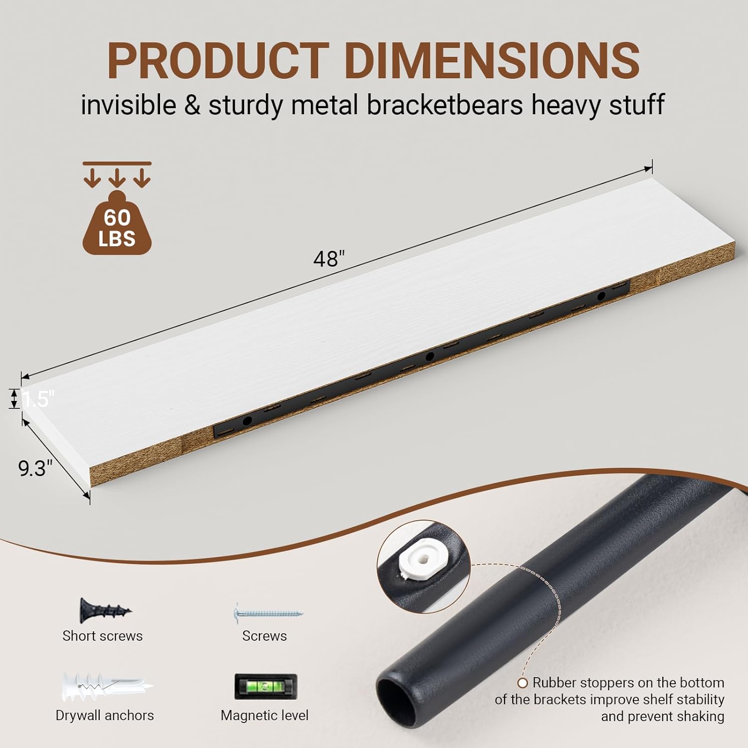 - 【Sturdy & Reliable Material】The white floating shelves 48 inches long use metal brackets and screws to be firmly fixed to the wall without sagging.Our white wall shelves are made of high quality MDF material,can hold up to 60 lbs to safely place your items.