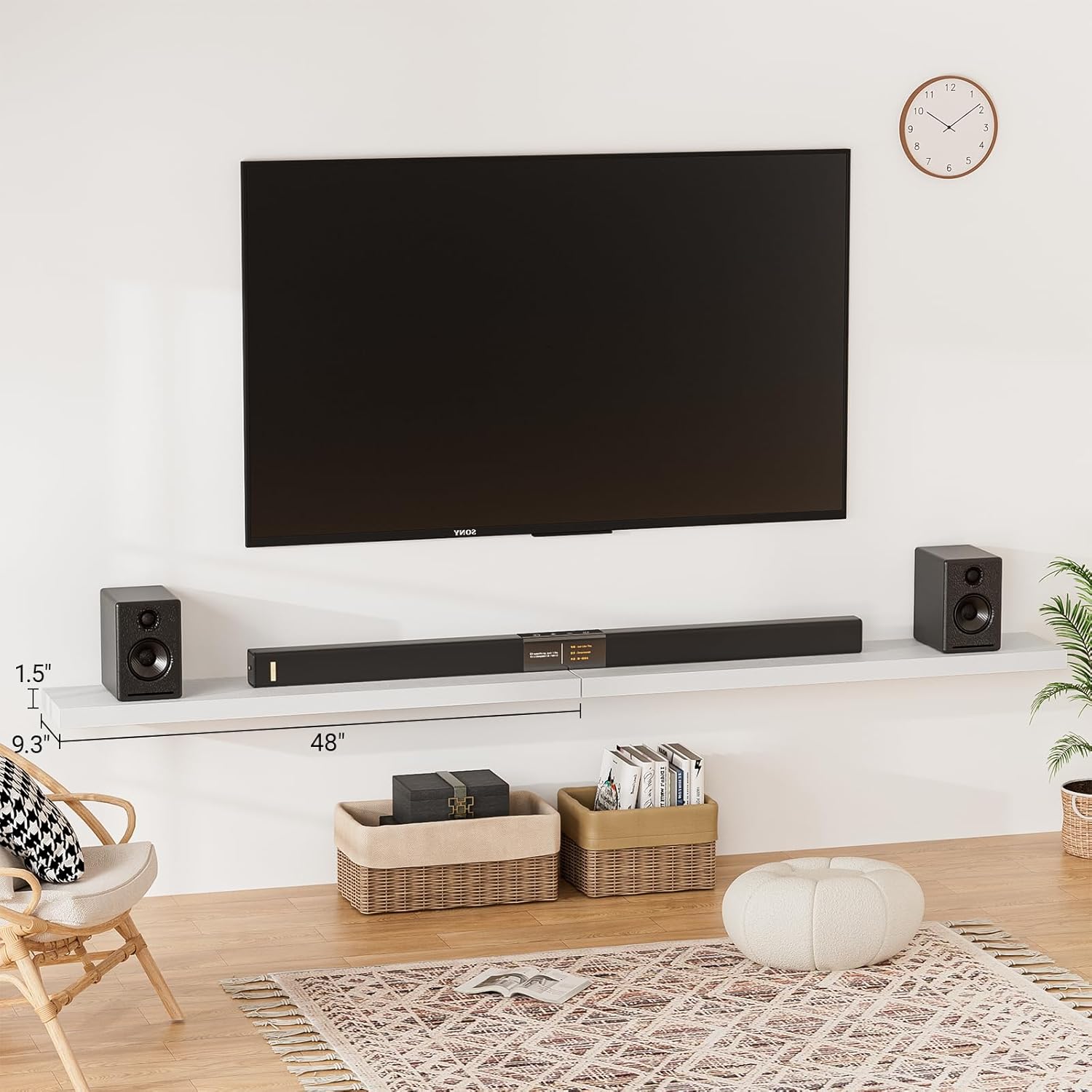 - 【Longer Design】Our pretty white floating shelves for wall are 48"W x 9.3"D x 1.5"H.Our wall shelf is longer than traditional designs and can hold more items.The white floating shelf optimize wall space,helping organize essentials without taking up floor space in your home.