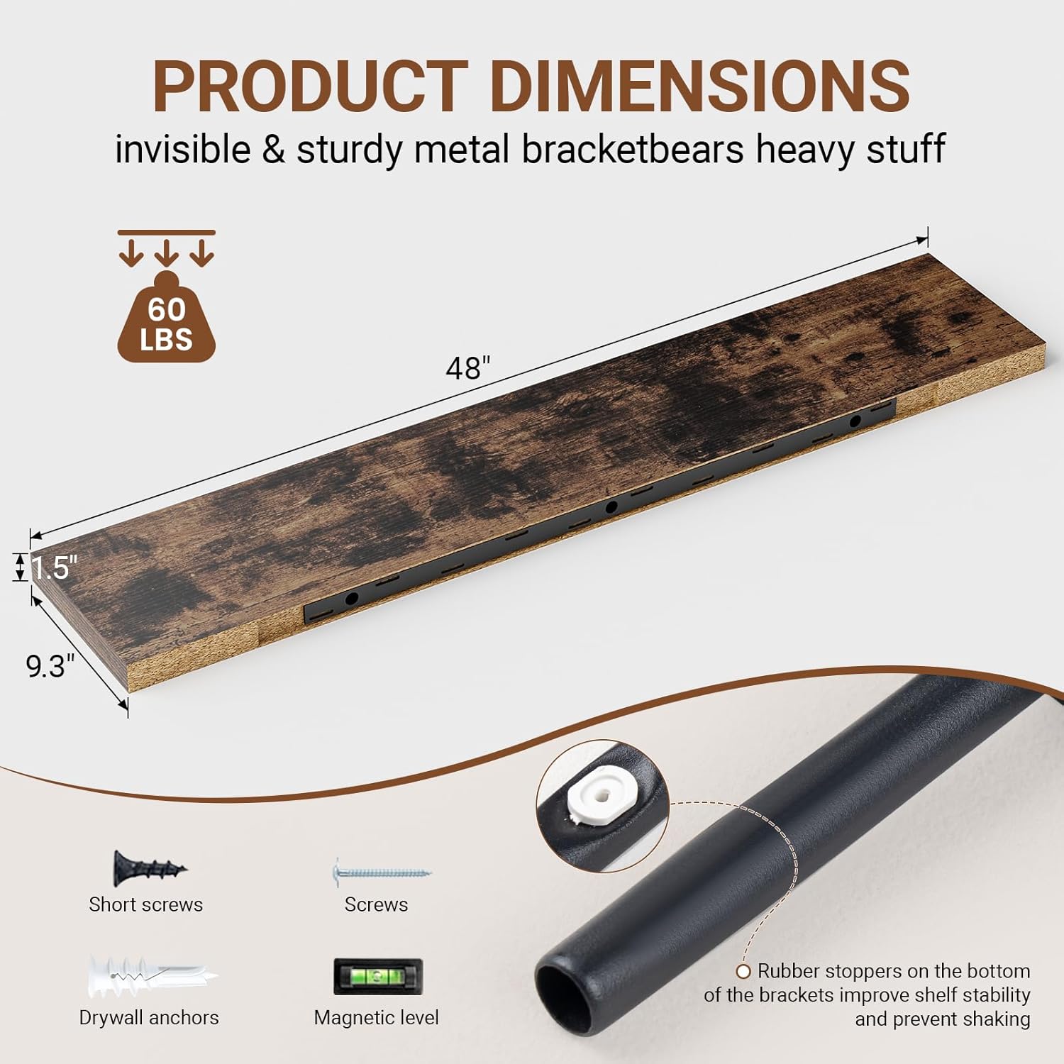 - 【Longer Design】Our pretty wall shelves are 48"W x 9.3"D x 1.5"H.Our brown floating shelves is longer than traditional designs and can hold more items.The rustic brown floating shelves optimize wall space,helping organize essentials without taking up floor space in your home.