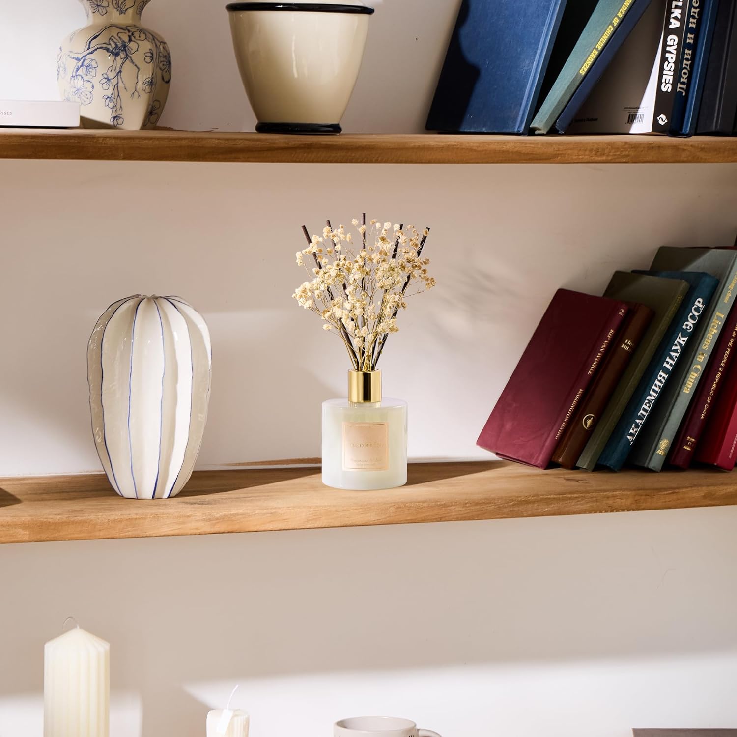 • Includes: One fragrance diffuser glass bottle, 6.76 fl oz mixture of essential oils combined with fragrance, one pc. of real preserved baby's breath flowers, and 8 pure cotton sticks. Adjust the amount of aroma released by adding or removing the sticks.