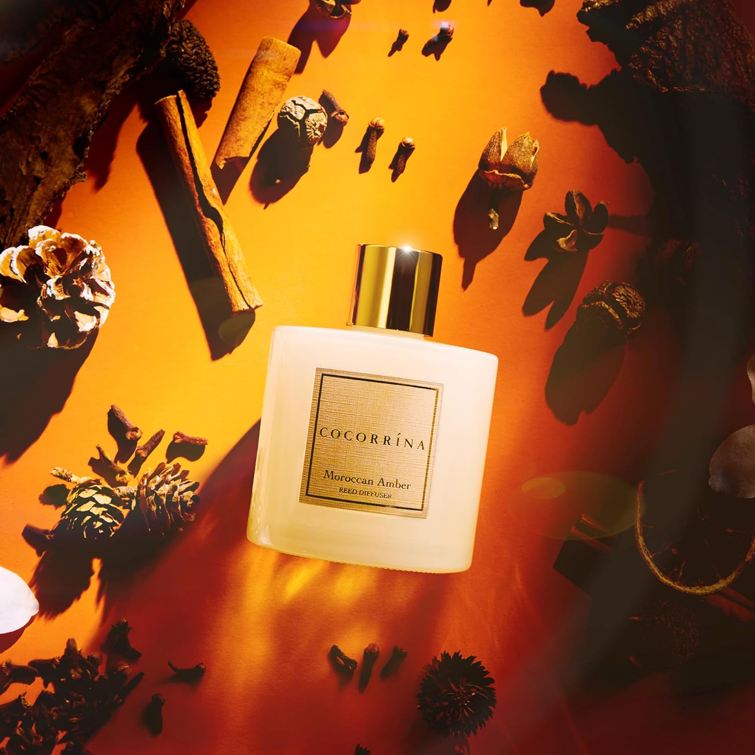 COCORRÍNA Reed Diffuser - Moroccan Amber 6.7 Fl.oz Reed Diffuser Set with Sticks & Preserved Baby's Breath, Reed Diffuser for Home Bathroom Shelf Decor