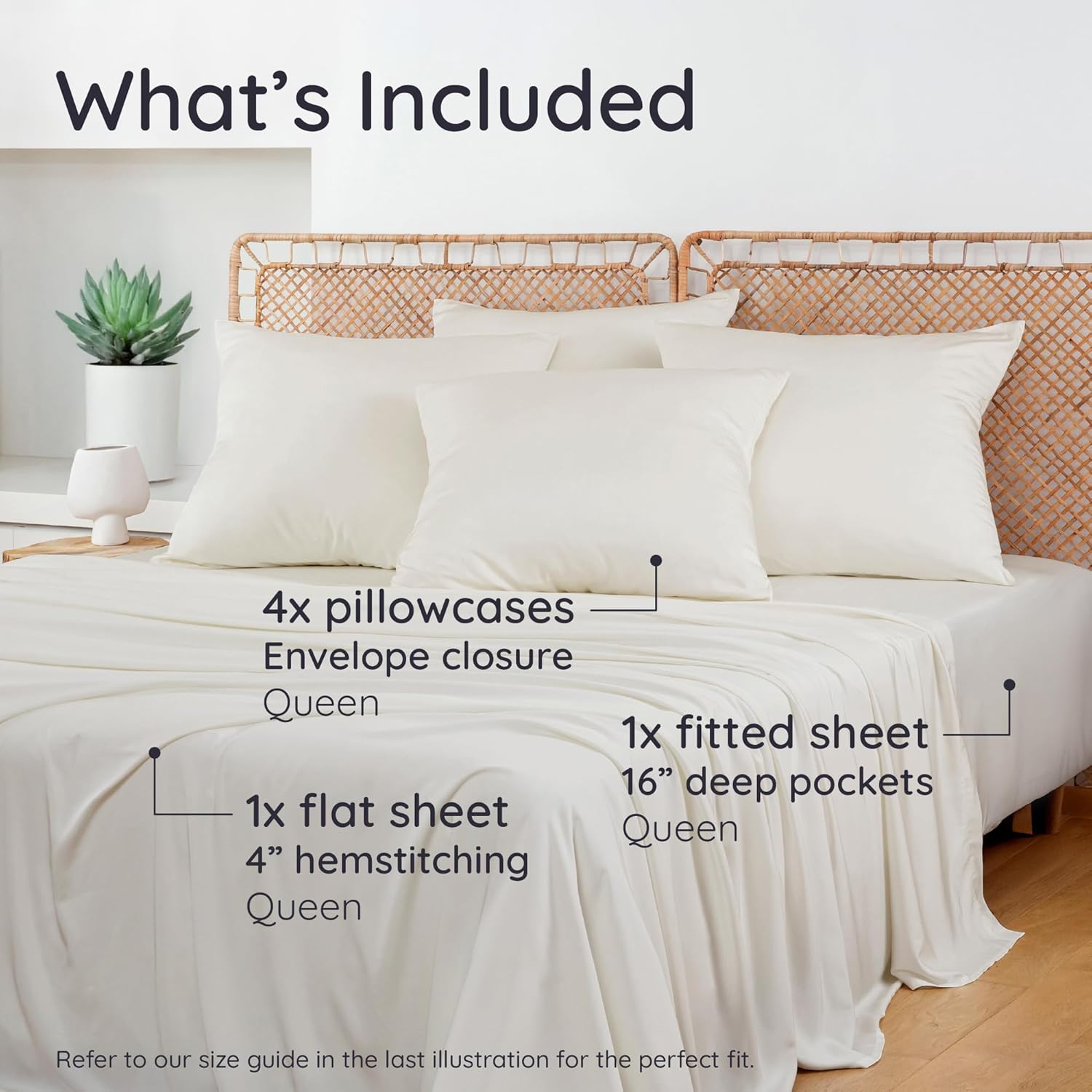 - Your Perfect Bedding Set: This 100% viscose derived from bamboo sheets queen size bed set includes 1 queen fitted sheet (60" x 80"), 1 queen flat sheet (90" x 102") and 4 queen pillowcases (20" x 30"). The pillowcases feature a sleek 8" envelope closure flap for a polished look and a secure fit, while the flat sheet is finished with an elegant 4" hem.