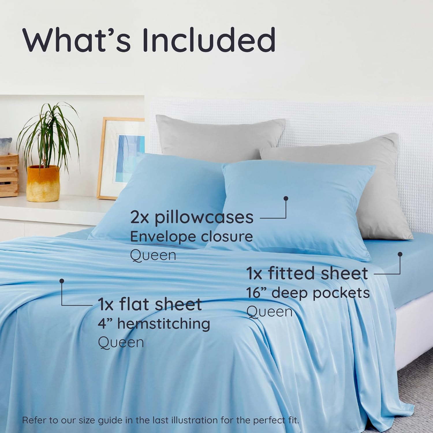 - Your Perfect Bedding Set: This 100% viscose derived from bamboo bedding queen set includes 1 queen fitted sheet (60" x 80"), 1 queen flat sheet (90" x 102") and 2 queen pillowcases (20" x 30"). The pillowcases feature a sleek 8" envelope closure flap for a polished look and a secure fit, while the flat sheet is finished with an elegant 4" hem.
